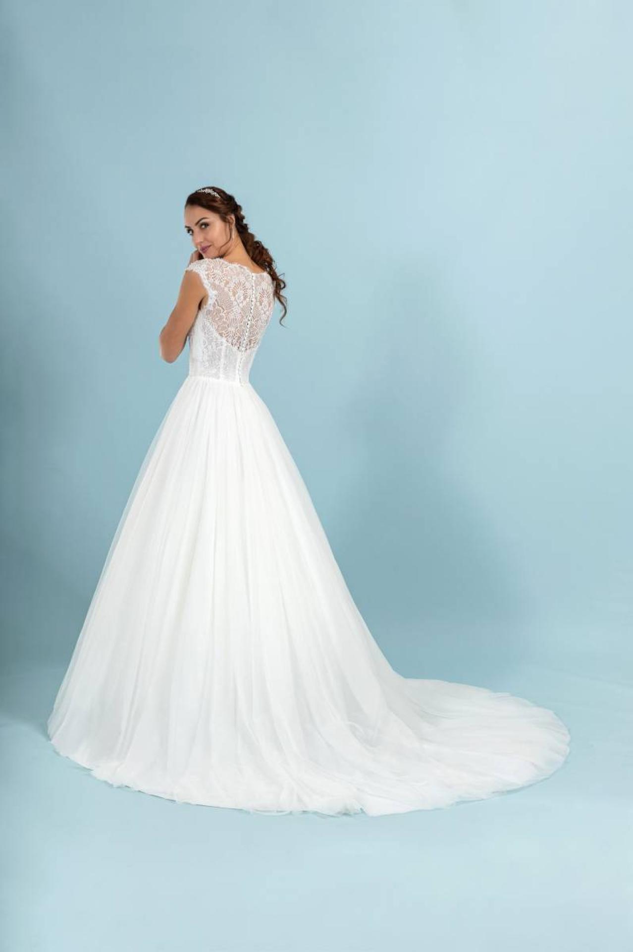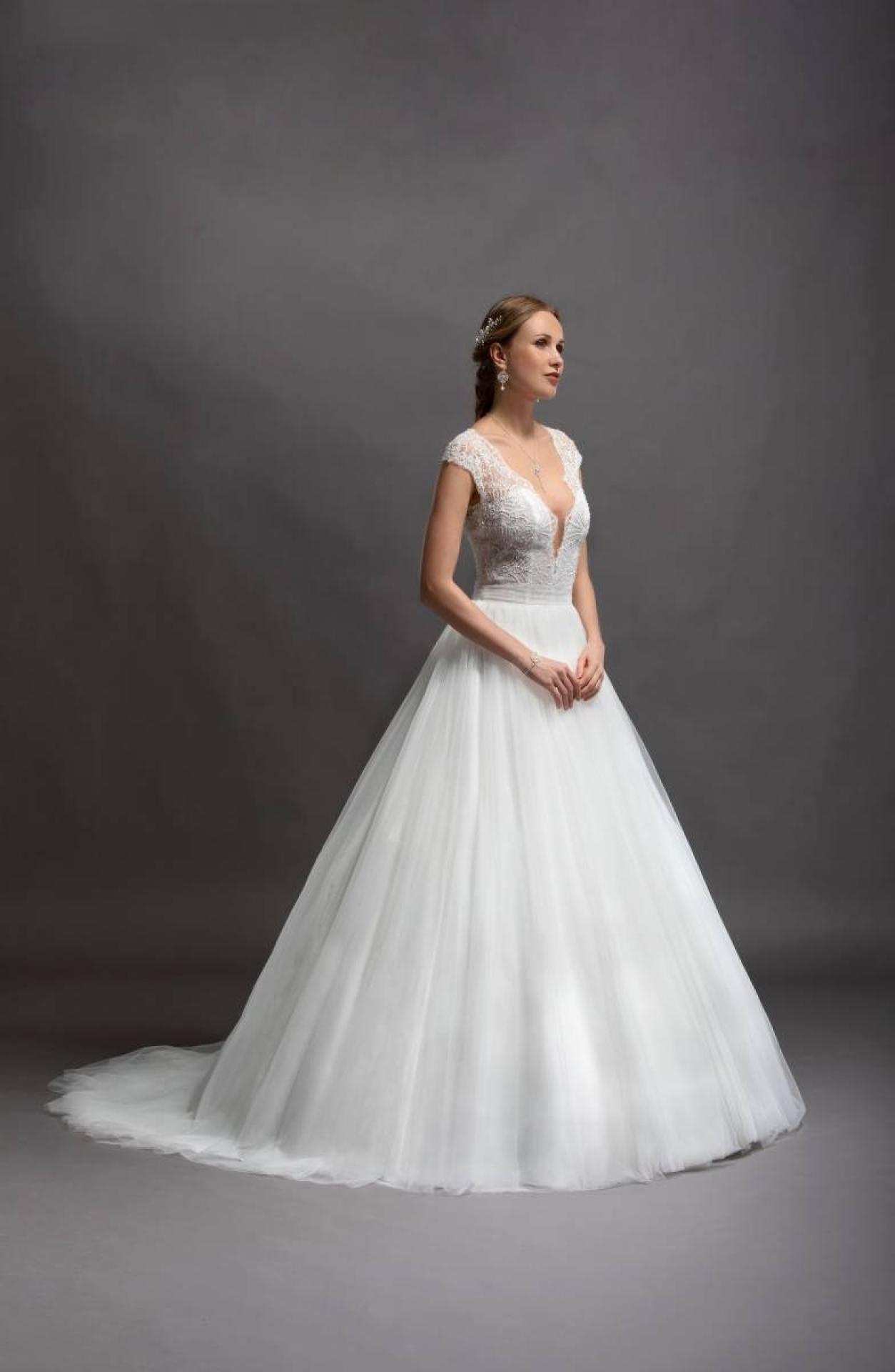 La robe de mariée référence ATTIRANCE collection Églantine Privé forme trapèze princesse, marque la taille par son bustier ajusté, le bas est composé de plusieurs couches de tulle doux et léger. Cette robe de créateur est agrémentée de dentelle chantilly au dos fermé et ses applications de guipure parsemées en dentelle fine qui apportent un coté chic majestueux et soyeux. Son joli décolleté dessine la poitrine et souligne votre taille et les courbes de votre cambrure.