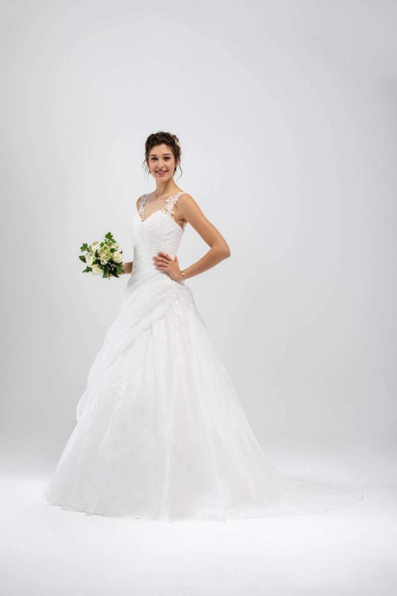La magie de ce modèle est assurée par des dentelles parsemées de sequins pour rappeler ce coté romantique glamour mais cette création demeure dans la famille des robes de mariée princesse au rapport qualité prix exceptionnel.