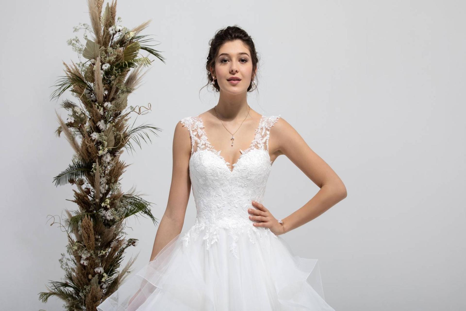 La robe de mariée romantique de la nouvelle collection 2020 Swing forme princesse volumineuse en tulle et chiffon de soie. Son joli décolleté en pointe donne un coté sensuel , féminin et glamour chic. Sa jupe "tutu" à volants marque l'originalité de ce modèle Églantine .