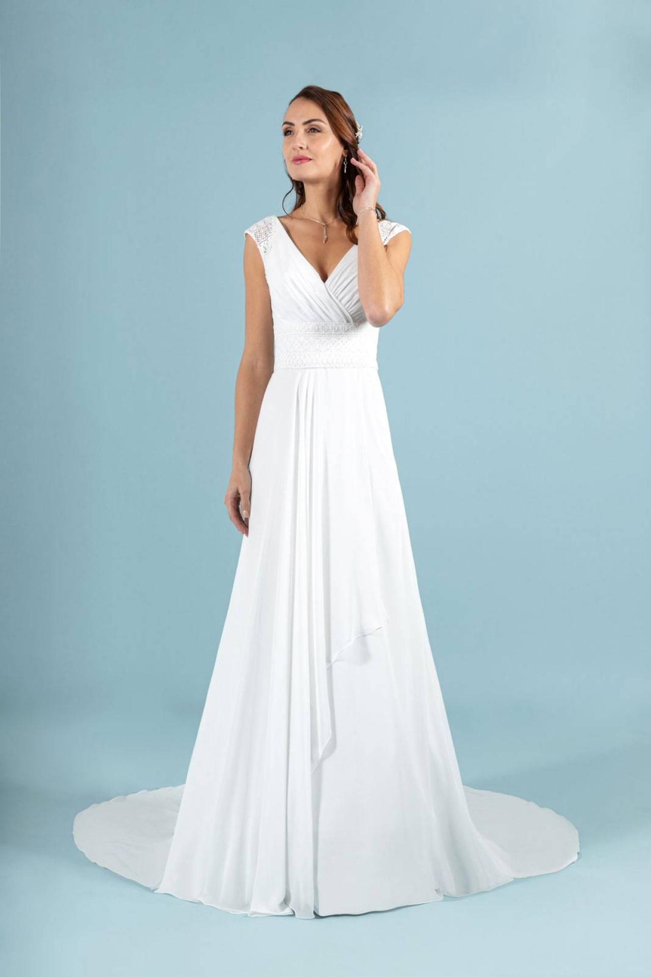 Robe de Mariée en dentelle graphique fluide Art de la nouvelle collection Églantine Créations 2023 disponible dans notre showroom Églantine à Marseille rue Breteuil.Ou acheter ma robe de mariée Art en mousseline et dentelle vintage forme droite sur Marseille proche Toulon, Bandol dans le département du Var à 30mn de Marseille par autoroute Toulon Nice.