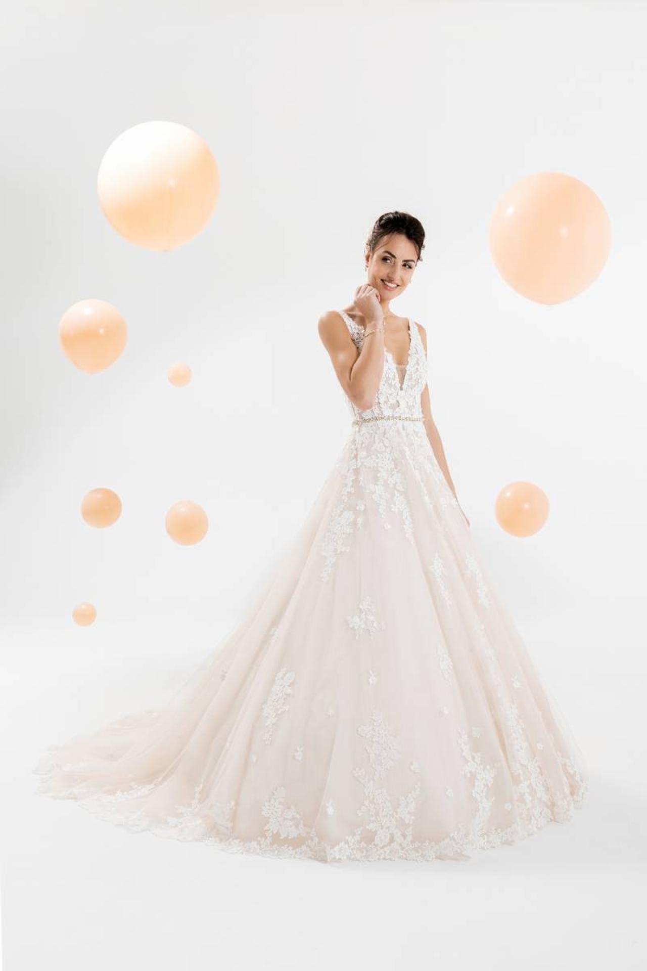 Vous avez toujours rêvé d'une robe majestueuse avec des empiècements en dentelle ? La somptueuse robe KARLA sera parfaite pour une mariée qui aime le style princesse. Cette robe de mariée est volumineuse car son jupon est bouffant et révèle un style féérique. Ce modèle glamour et romantique mettra en avant votre décolleté grâce à sa forme plongeante ainsi qu'aux broderies forales et scintillantes qui le recouvrent.