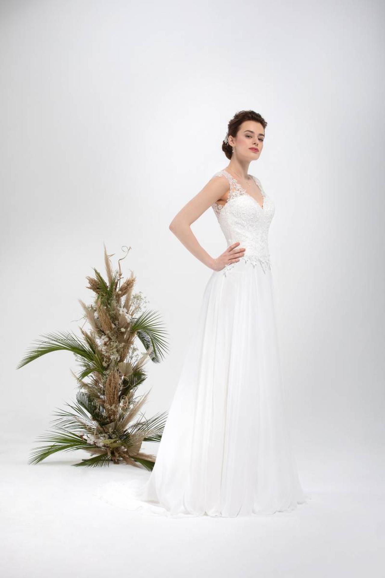 La robe de mariée en dentelle Sacha forme fluide et légère en mousseline de soie. Cette robe de mariée vintage est marquée d'un joli dos en V avec un liseré de dentelle française qui vient sublimer votre dos. Avec la robe de mariée Sacha vous vous assurez une totale aisance et confort pour votre mariage. Quelques boutons et brides de fermeture viennent dessiner et sublimer la cambrure.