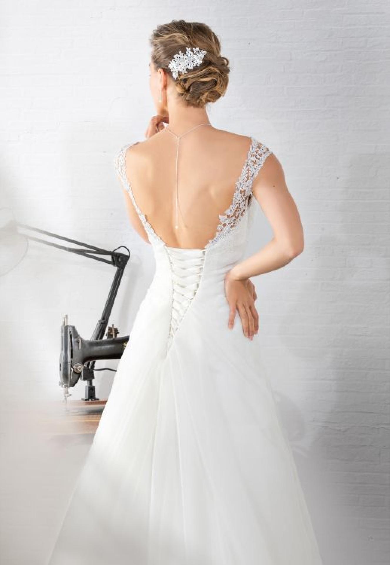 Votre robe de mariée pas cher est une robe princesse en dentelle de Calais sur Marseille. De jolies bretelles en perles donnent de l'éclat a votre robe de mariée. Vous avez également un dos dégagé magnifique, qui viens marquer votre cambrure et votre taille.