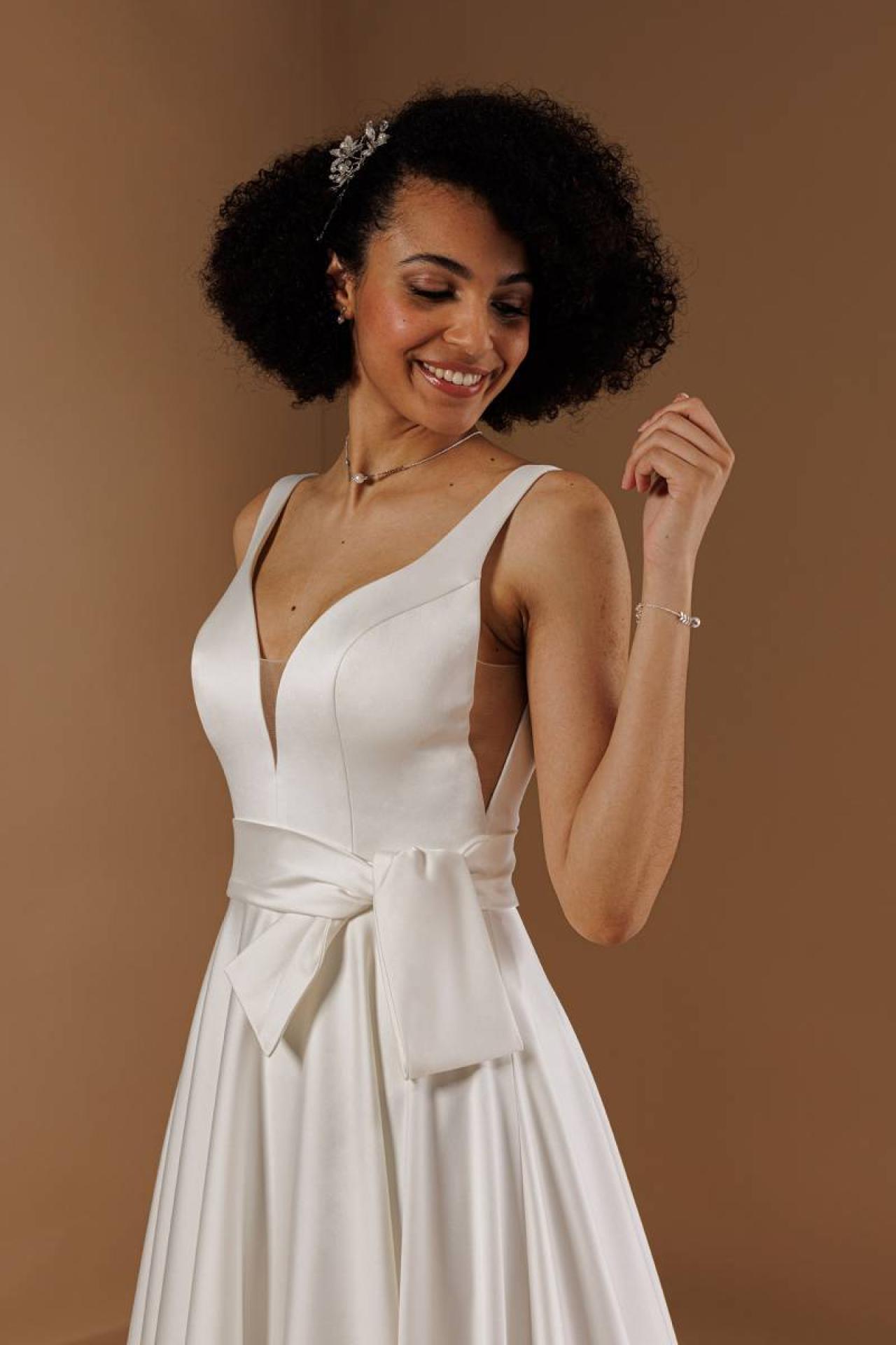 Vous recherchez une robe chic en mikado ? La robe Glasgow est faite pour vous ! Sa forme droite et sa traine courte apporte un coté fluide à votre tenue de cérémonie.