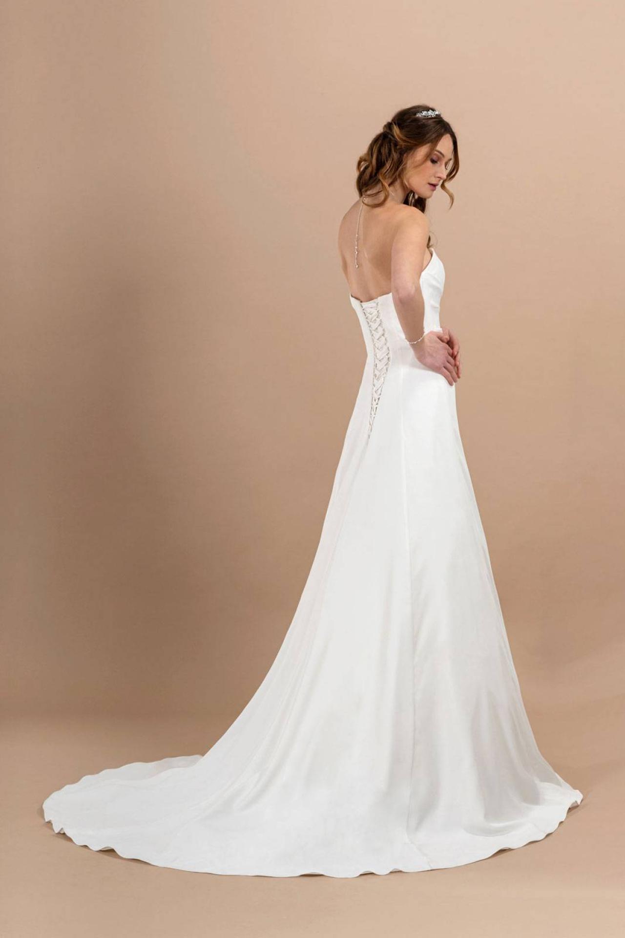 Cette robe simple et fluide est idéale pour un mariage bohème en extérieur, sa petite traine et sa légèreté feront la différence, la mariée passera une soirée pleinement en profitant de son mariage et de tous ces instants.