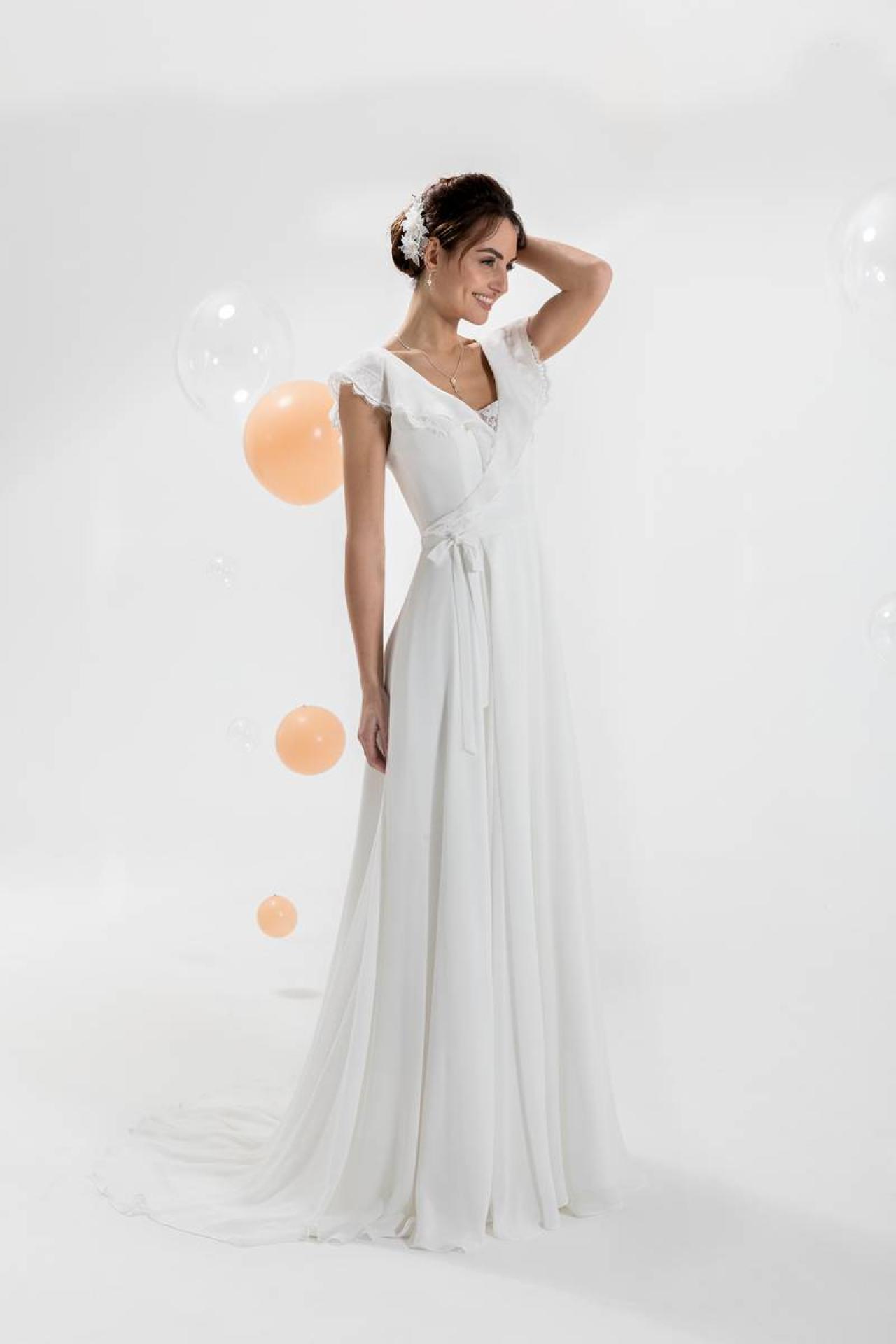 Cette fabuleuse robe de mariée simple, fluide et aérienne, sublimera votre silhouette et fera de vous une mariée moderne.