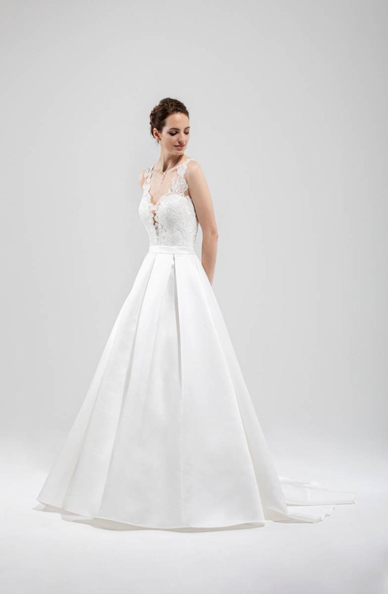 La robe de mariée de créateur référence Sisi forme princesse glamour en satin duchesse. Sa jupe classique en satin chic rappelle les année 50. Le bustier de la future mariée à dentelle florale donne un coté élégant et haute couture.