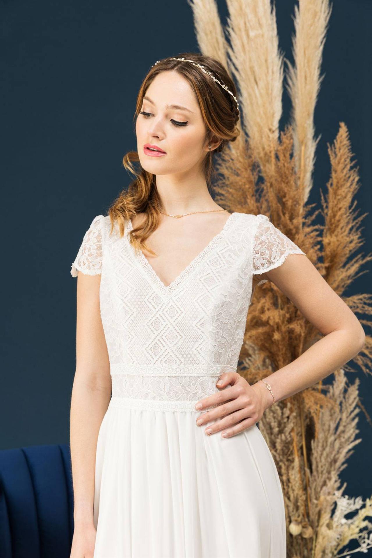 La robe de mariée bohème de la nouvelle collection 2022 CACHEMIRE en mousseline et décolleté en V donne un coté sensuel , féminin et glamour chic souligné par une jupe virevoltante et aérienne