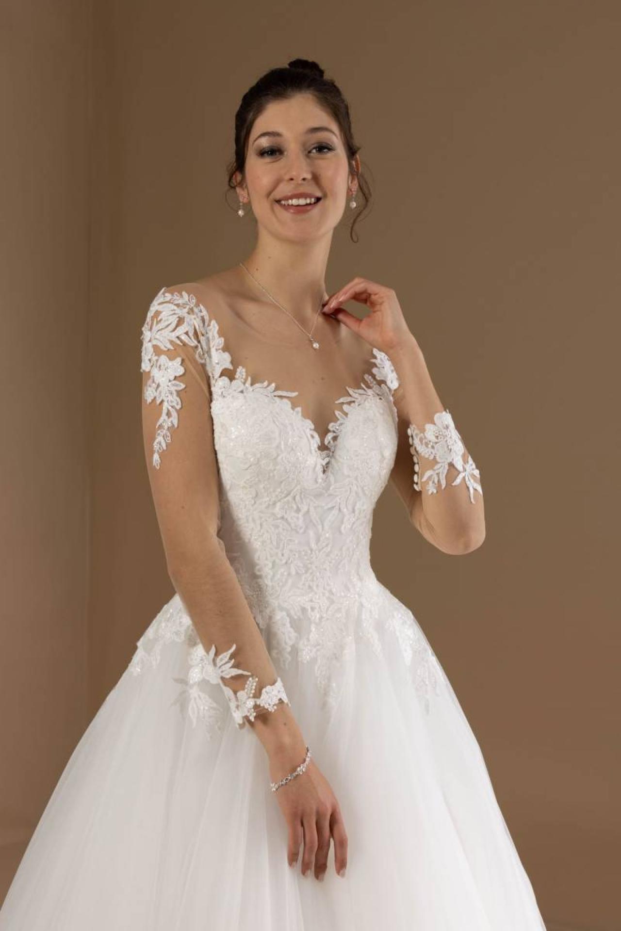 Venez découvrir cette robe de mariée à manche longue en dentelle dans notre espace couture situé dans le centre ville de Marseille et à proximité des villes comme Aix en Provence ou Puyricard.