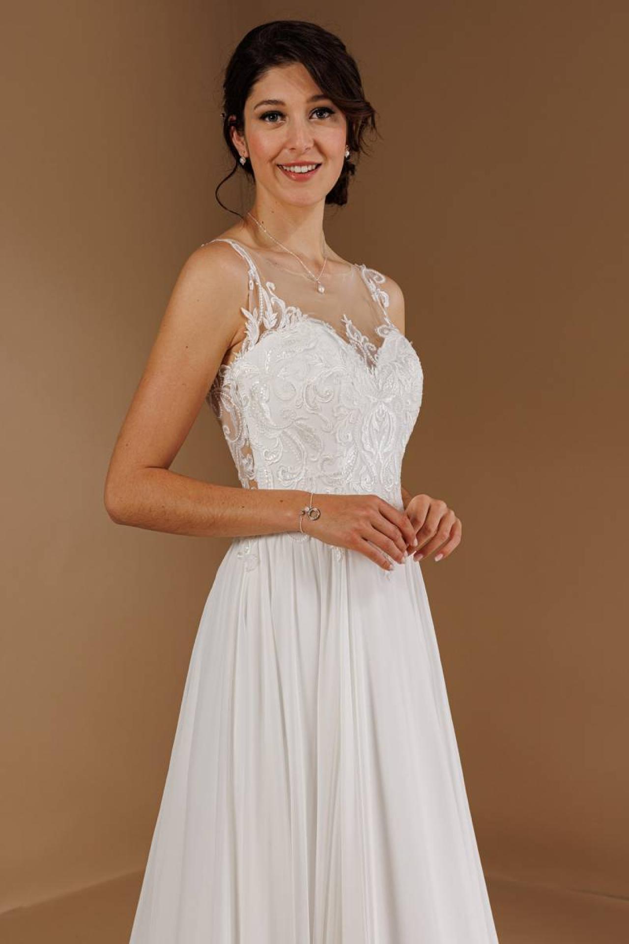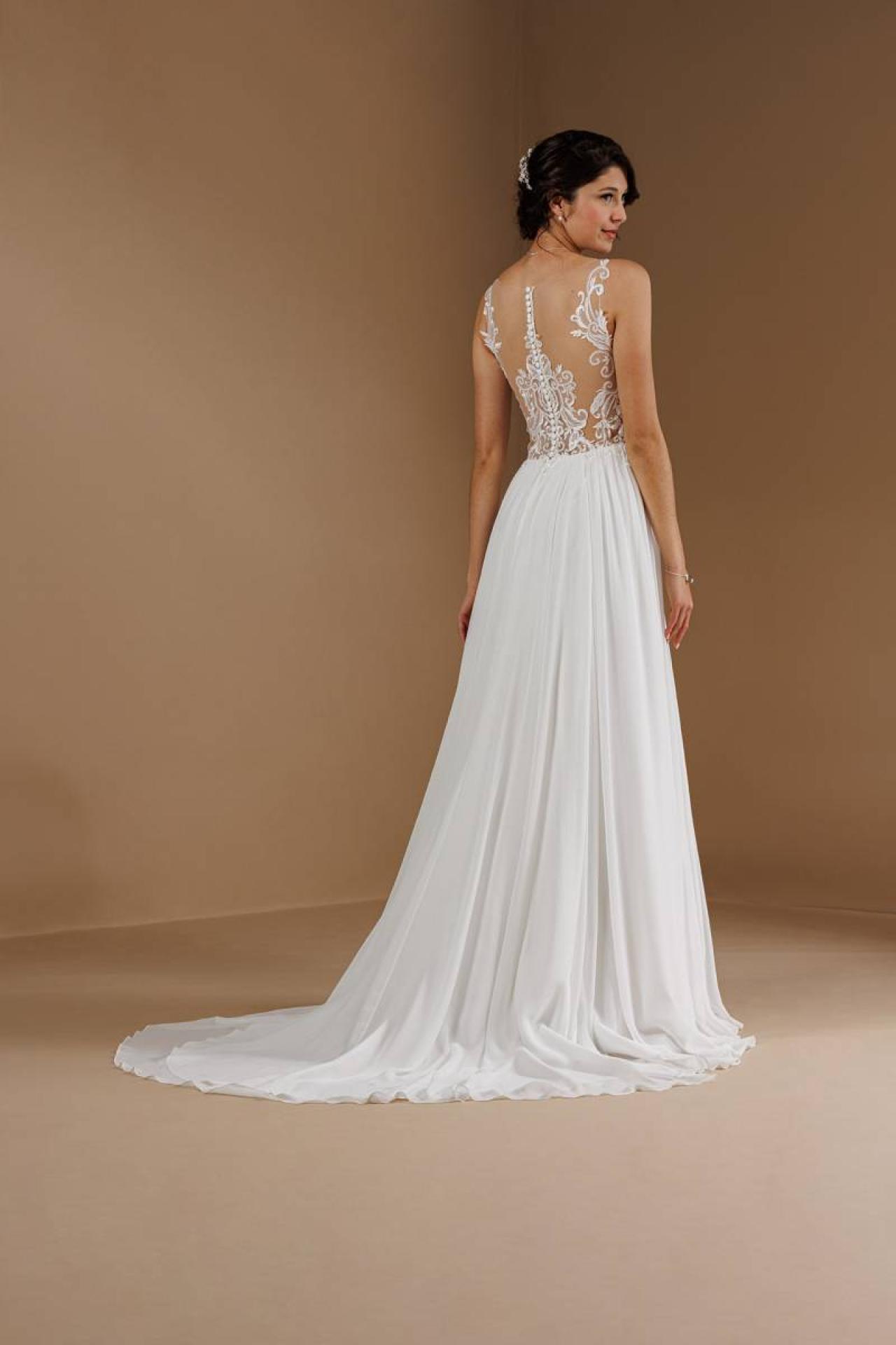 Vous cherchez une robe dans un style fluide et élégant ? la robe de mariée Guyane sera parfaite pour votre mariage bohème chic. Venez essayer une robe de mariée avec une jupe en mousseline et un bustier décolleté coeur avec un dos transparent en dentelle.
