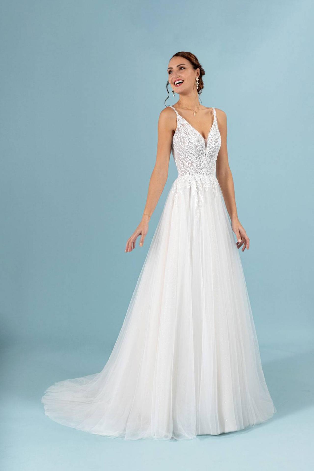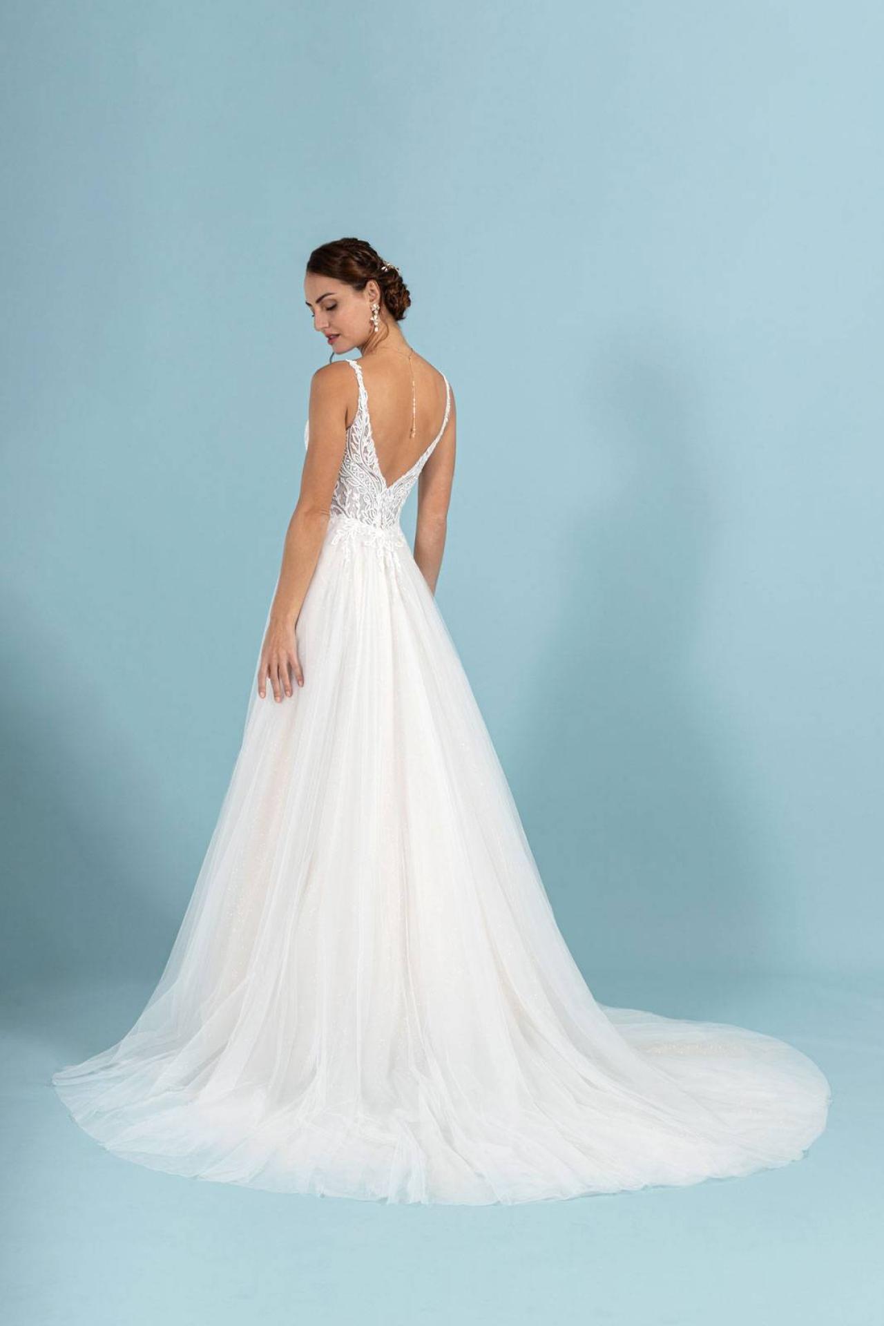 Robe de mariée de marque EGLANTINE référence GAYA proposée dans notre boutique Anthea N'DRI Marseille au 74 rue Breteuil 13006 Marseille, Robe de mariage forme trapèze en dentelle marque Églantine référence Gaya disponible dans notre show room Marseille.