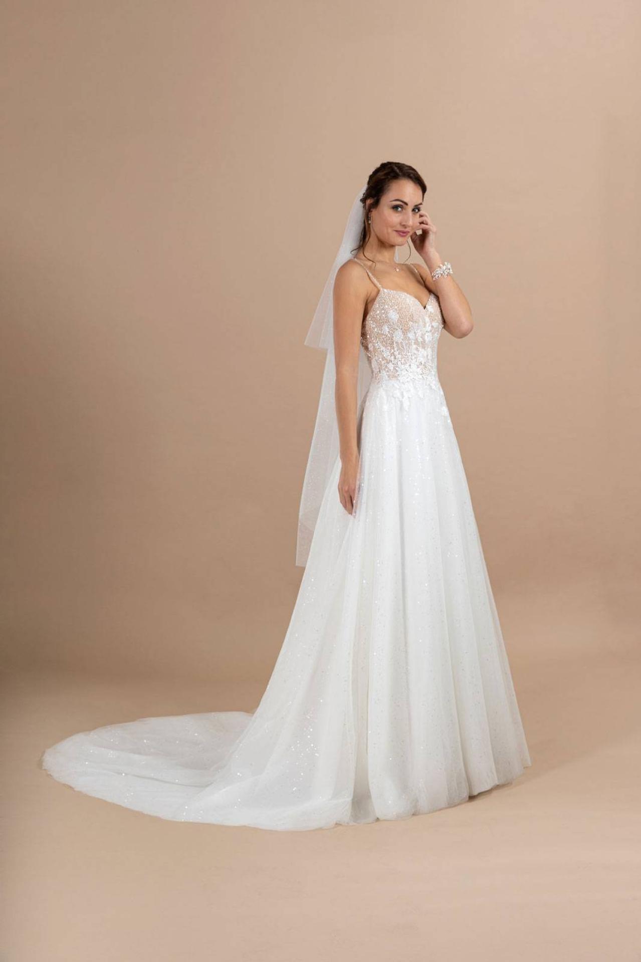 Robe de Mariée fluide haut dentelle et bas de tulle touché de soie référence Alanna de la nouvelle collection Églantine Créations 2023 disponible dans notre showroom Églantine à Marseille 74 rue Breteuil 13006. Robe de mariée bohème Alanna Églantine créations à découvrir dans notre show room Marseillais .