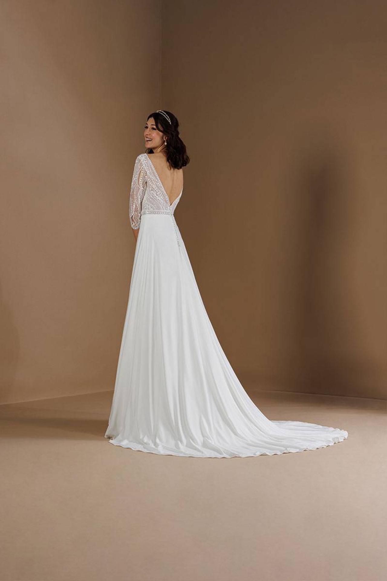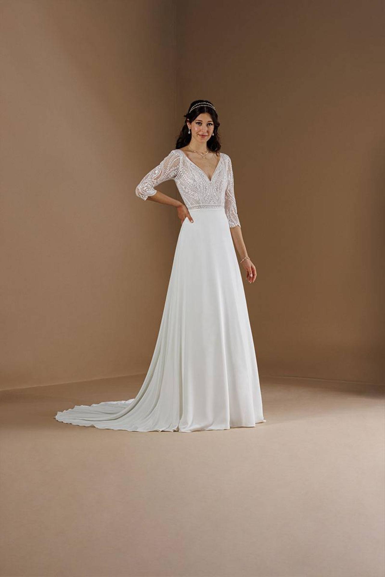 Cette robe de mariage incarne l'essence même du style champêtre chic, alliant élégance moderne et légèreté pour un look inoubliable le jour de votre mariage.