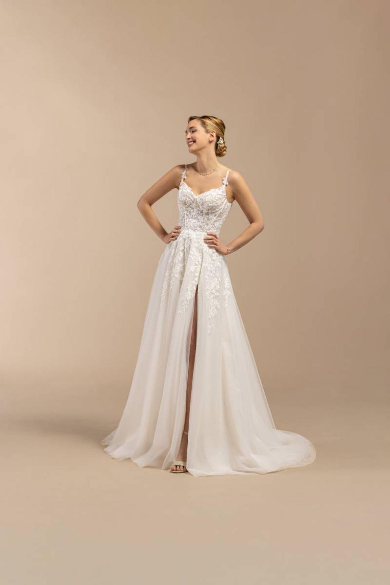 Coloris disponibles : Proposée principalement en blanc ou ivoire, en accord avec la tradition nuptiale tout en ayant un tombé lumineux et léger.