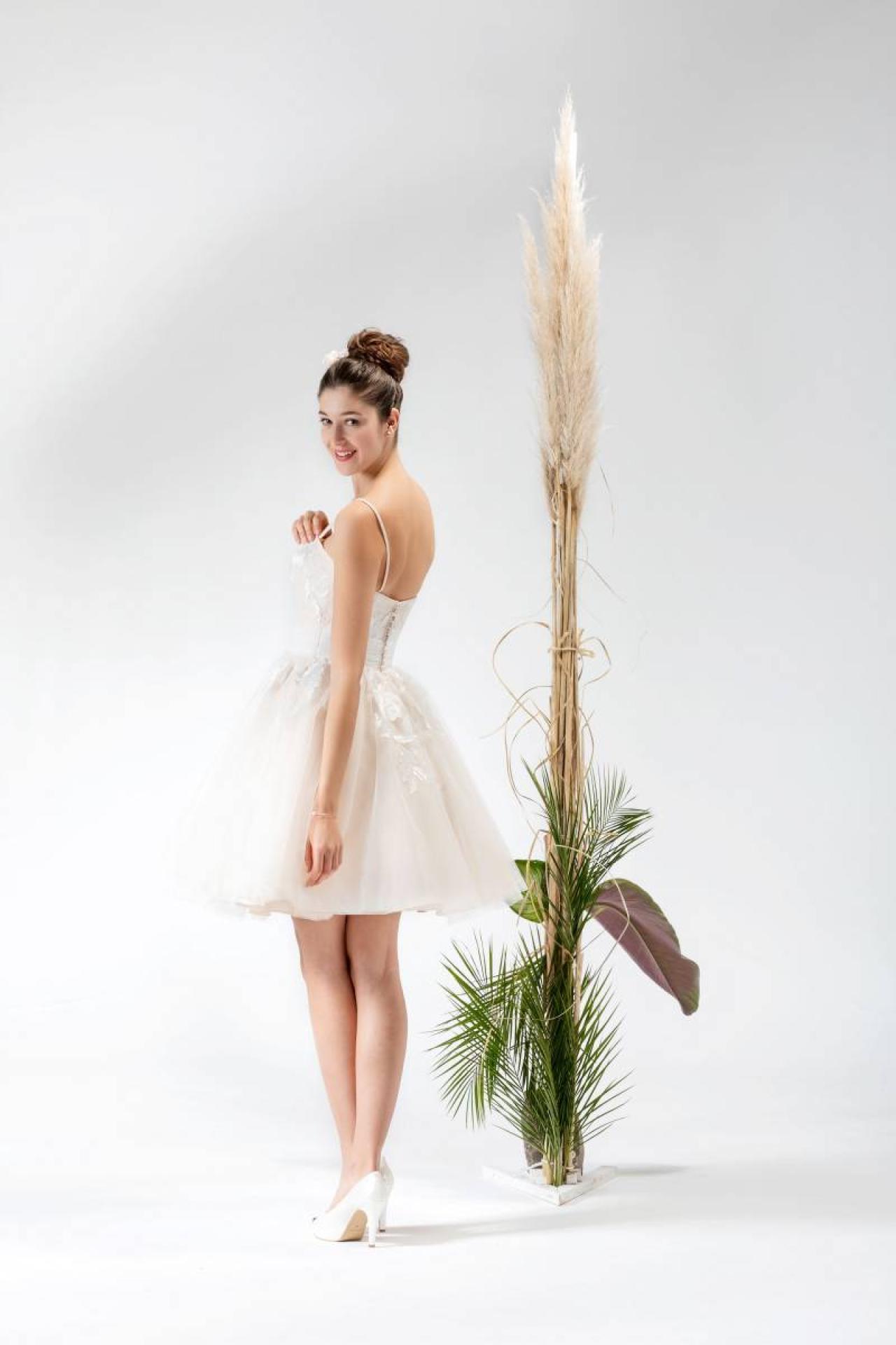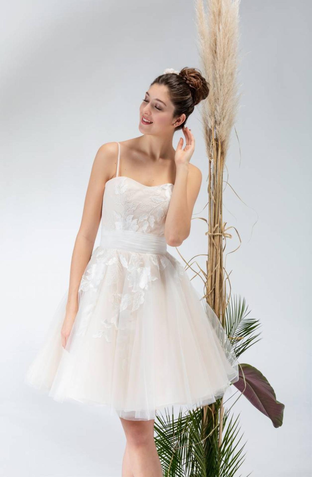 La robe de mariée Sensible, robe courte, idéale pour la mairie en tulle touché soie. Votre taille est bien soulignée grâce à la ceinture plissée. Très fines bretelles pour garder un coté aérien et dégagé. Votre robe est agrémentée d'une dentelle fleurie pas commune et atypique. La robe Sensible est disponible dans notre showroom en différentes colories : ivoire, blanc et ivoire blush.