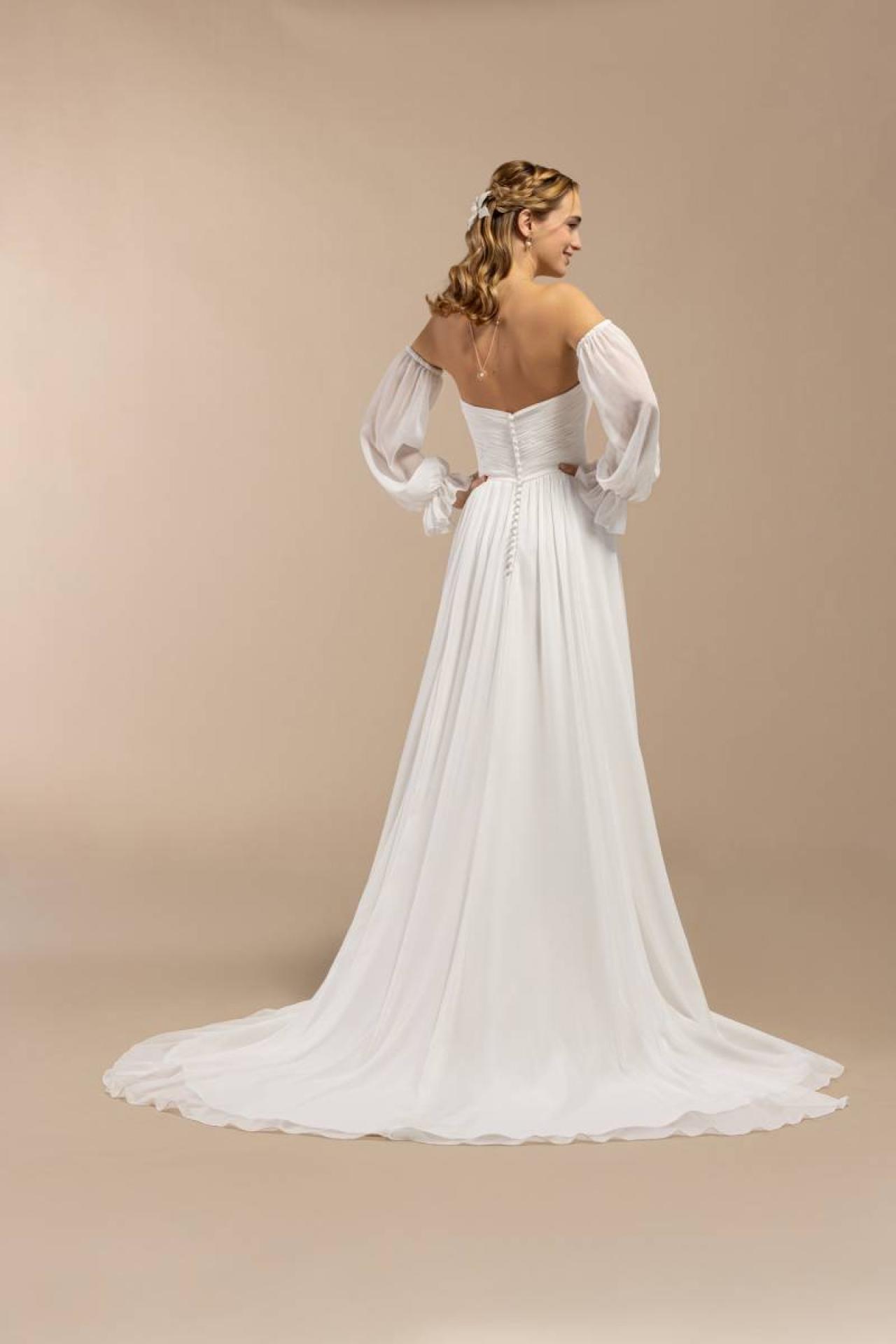 Envie de transformer le modèle ? L’atelier propose des personnalisations couture sur devis après validation technique : modification de la coupe, ajout ou retrait des manches, valorisation des détails… Tout est envisageable pour rendre votre robe de mariée unique.