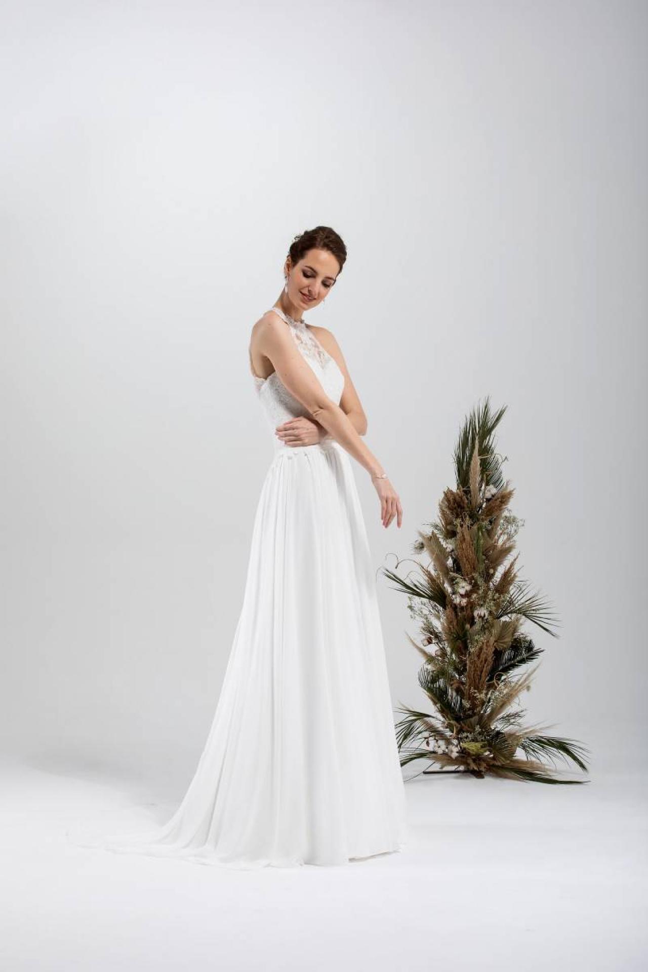 La robe de mariée Sandra, robe fluide en mousseline de soie légère et aérienne. Suivie d'un joli dos en forme de goutte en dentelle de Calais. Son bustier emmanchures Américaines marque l'originalité et le coté moderne de cette robe de mariée Églantine Marseille.