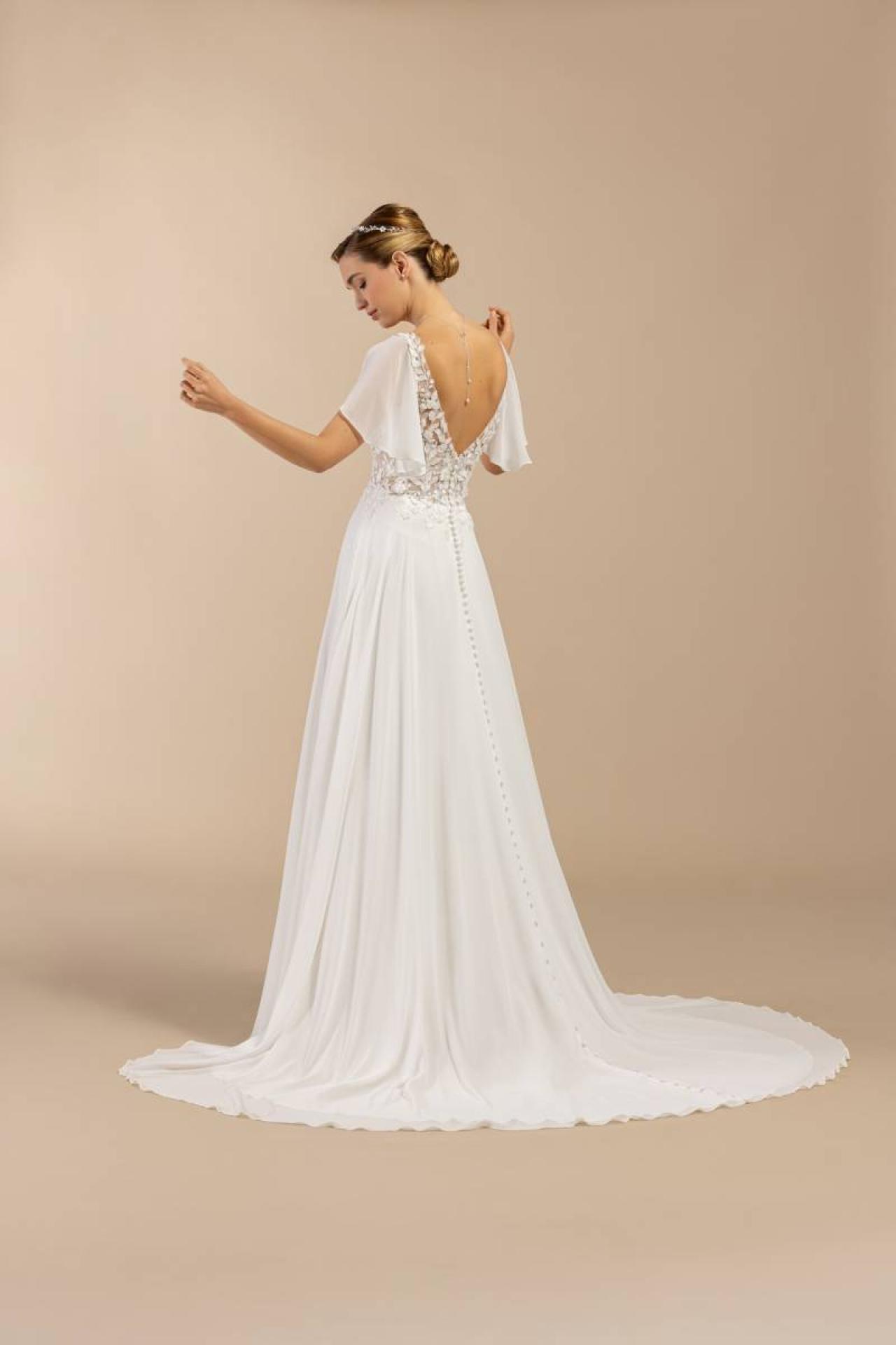 Votre adresse d’exception pour essayer la robe de mariée fluide avec manche modèle Bonheur, collection Églantine, proche de Plan de Campagne. Élégance, accompagnement couture, retouches en atelier et personnalisation à la clé pour un mariage inoubliable.