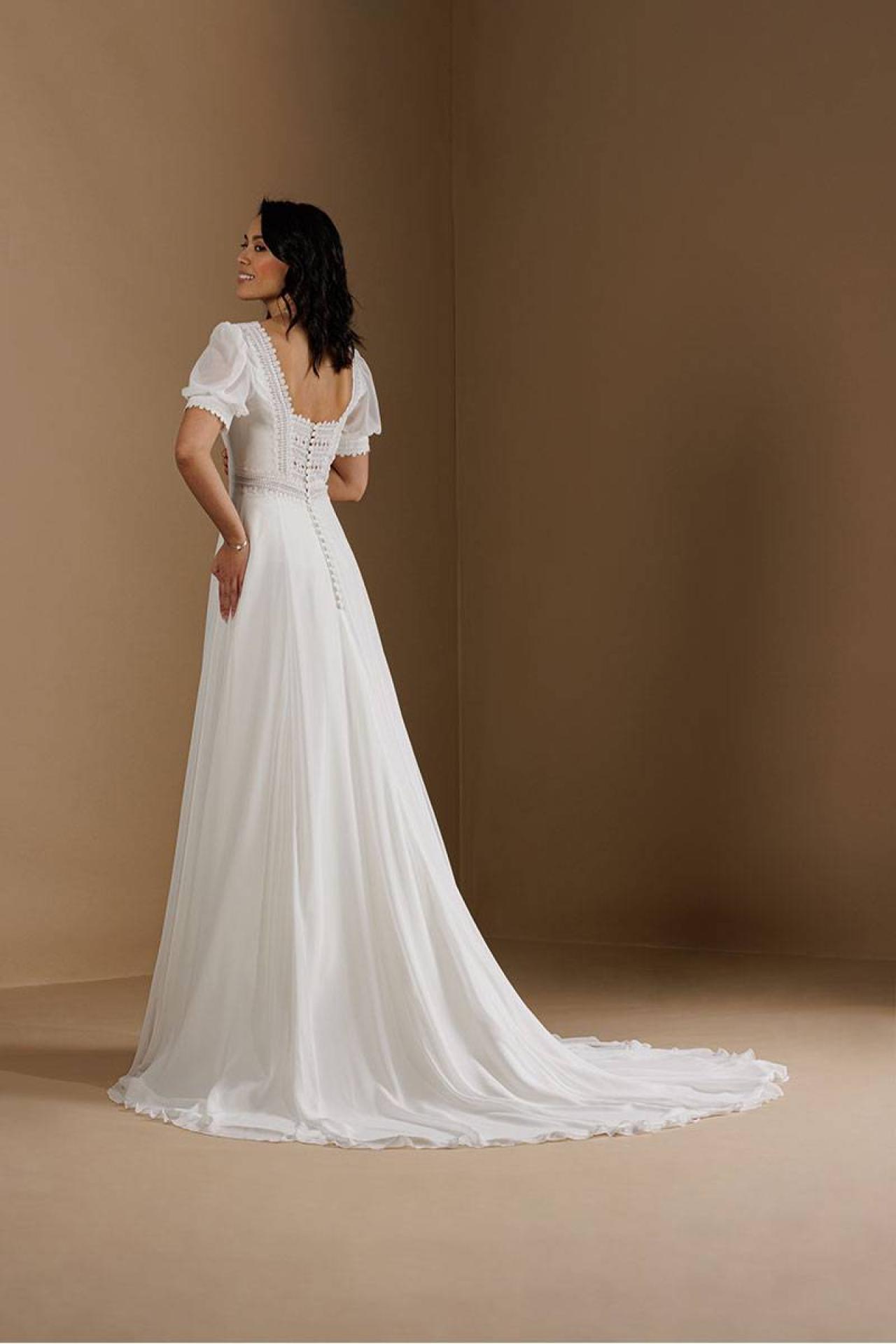 Cette création unique allie à merveille le charme vintage et une touche de modernité, pour un look inoubliable le jour de votre mariage.