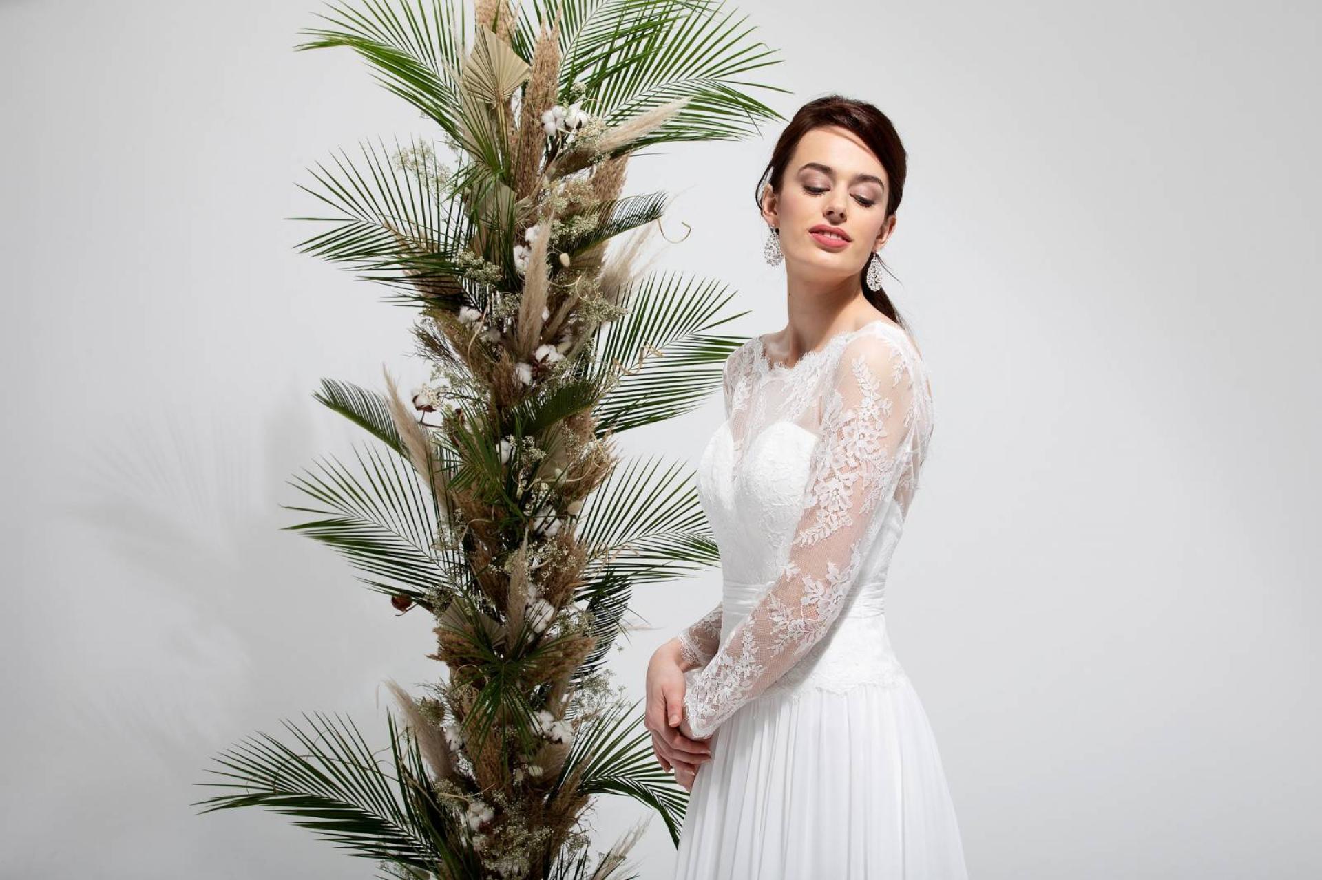 La robe de mariée Saphia manches longues en dentelle forme fluide et aérienne en mousseline touché soie. Elle est marquée d'un jolie dos en V en dentelle chantilly et ses manches idéales pour un mariage religieux. Son bustier en coeur est orné d'une dentelle fine chantilly se prolongeant en manches longues. Sa ceinture souligne et marque la taille de la future mariée.