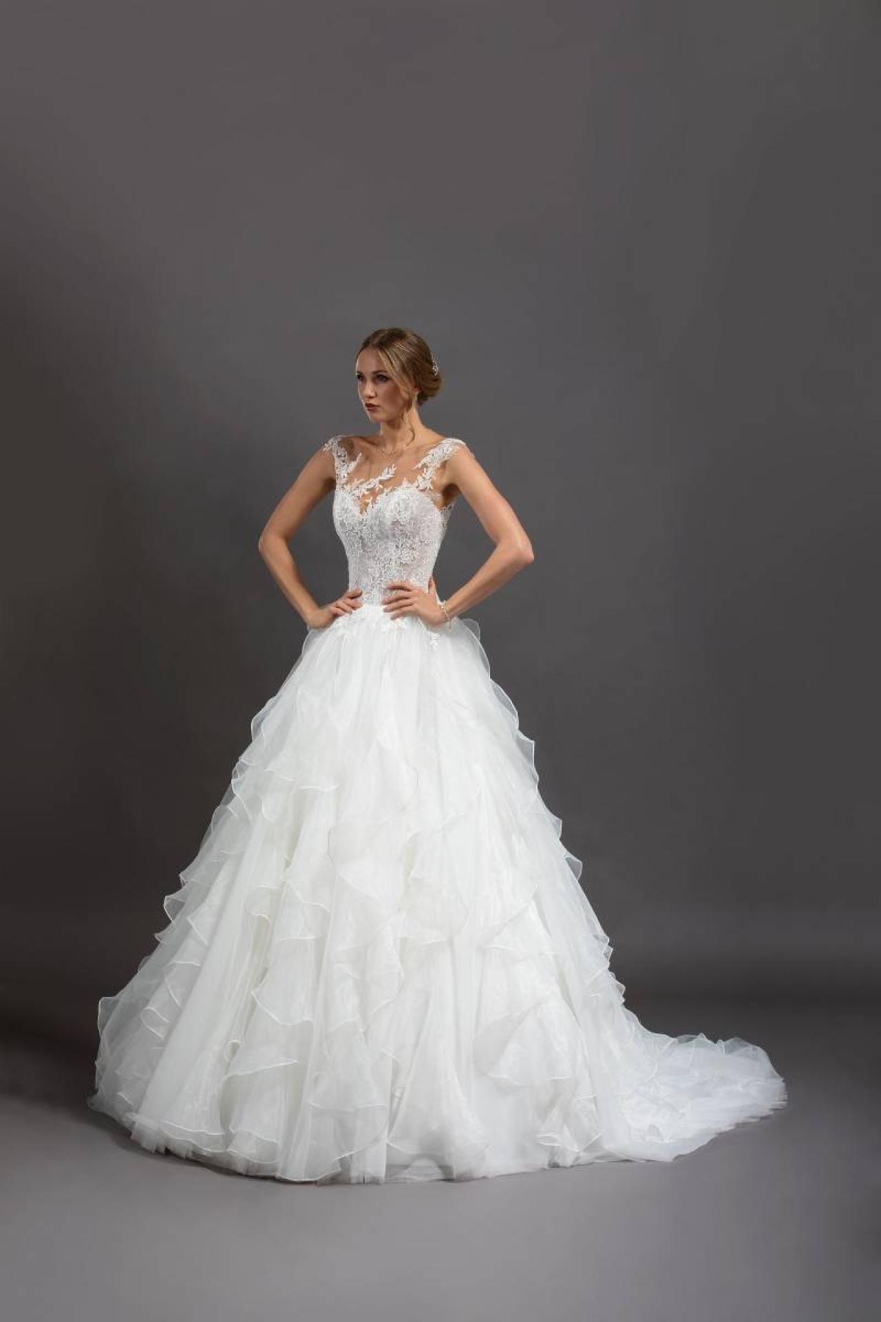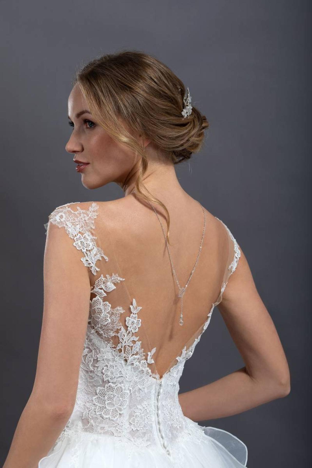 La robe de mariée Jolie forme princesse collection Églantine Privé glamour en tulle taffetas porte bien son nom . Cette robe pour un mariage moderne est marquée d'un joli dos en V de tulle cristal en effet tatouage qui apporte de la modernité et va mettre en avant votre sculpture. Le devant de la robe de mariée est tout en tulle couleur peau avec des dentelles appliquées et parsemées sur le buste qui donnent ce coté chic et atypique.
