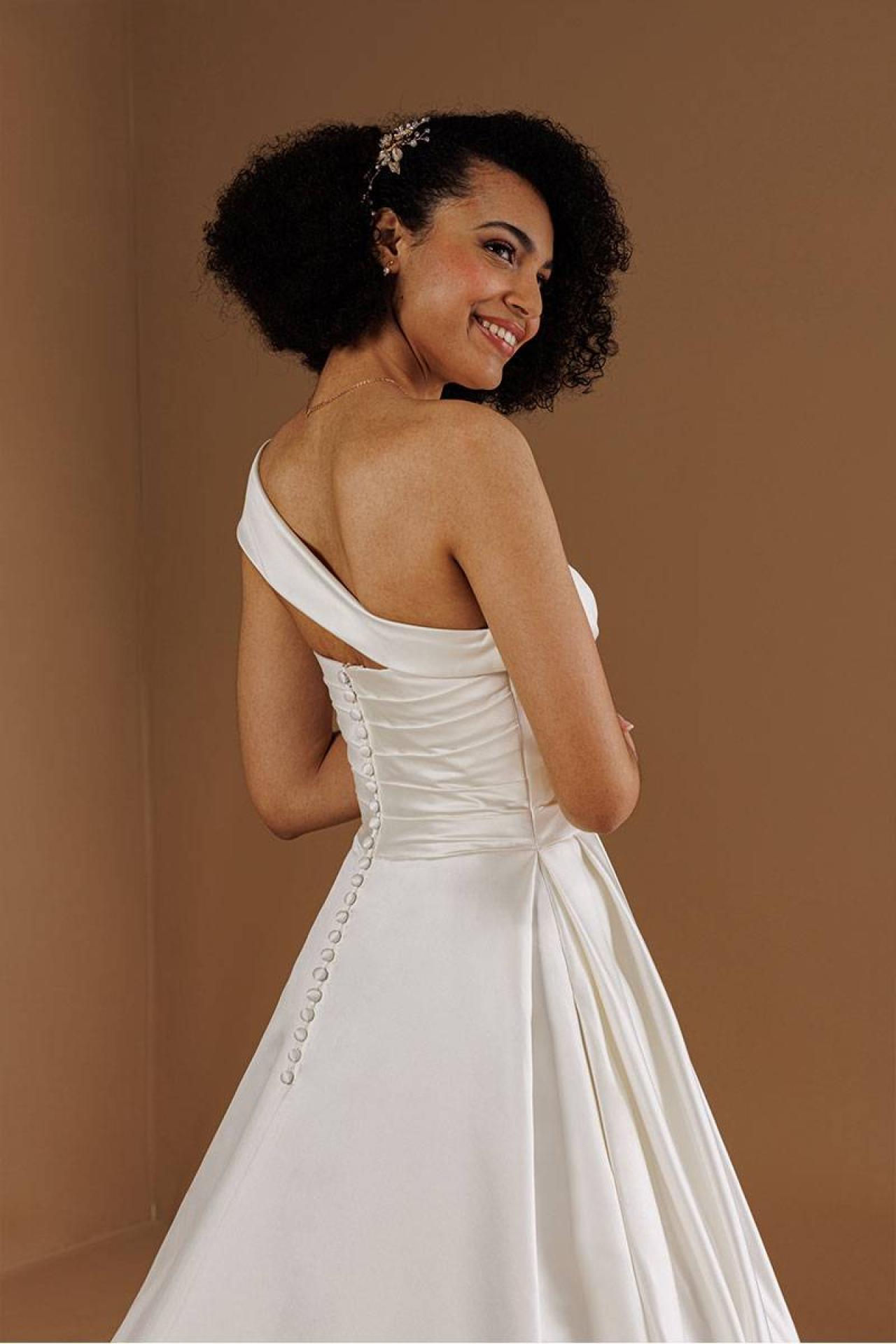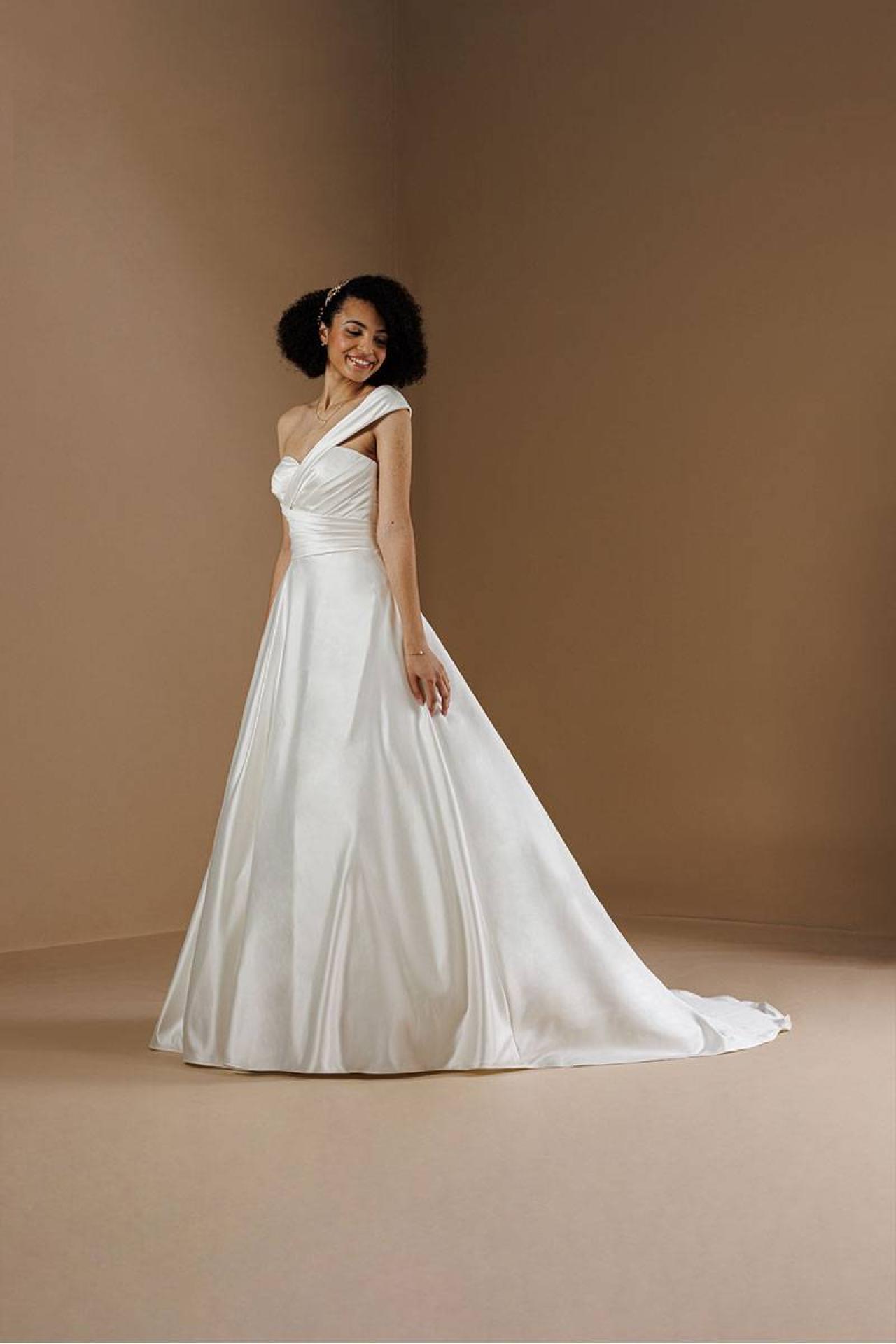 Cette robe de mariée allie élégance et modernité, parfaite pour les futures mariées souhaitant marquer les esprits le jour de leur mariage. Le drapé délicat du décolleté ajoute une dimension romantique, tandis que l'asymétrie des bretelles introduit une note contemporaine. Sa coupe princesse assure une allure majestueuse, idéale pour une cérémonie dans les lieux emblématiques de Marseille ou sur la côte méditerranéenne.