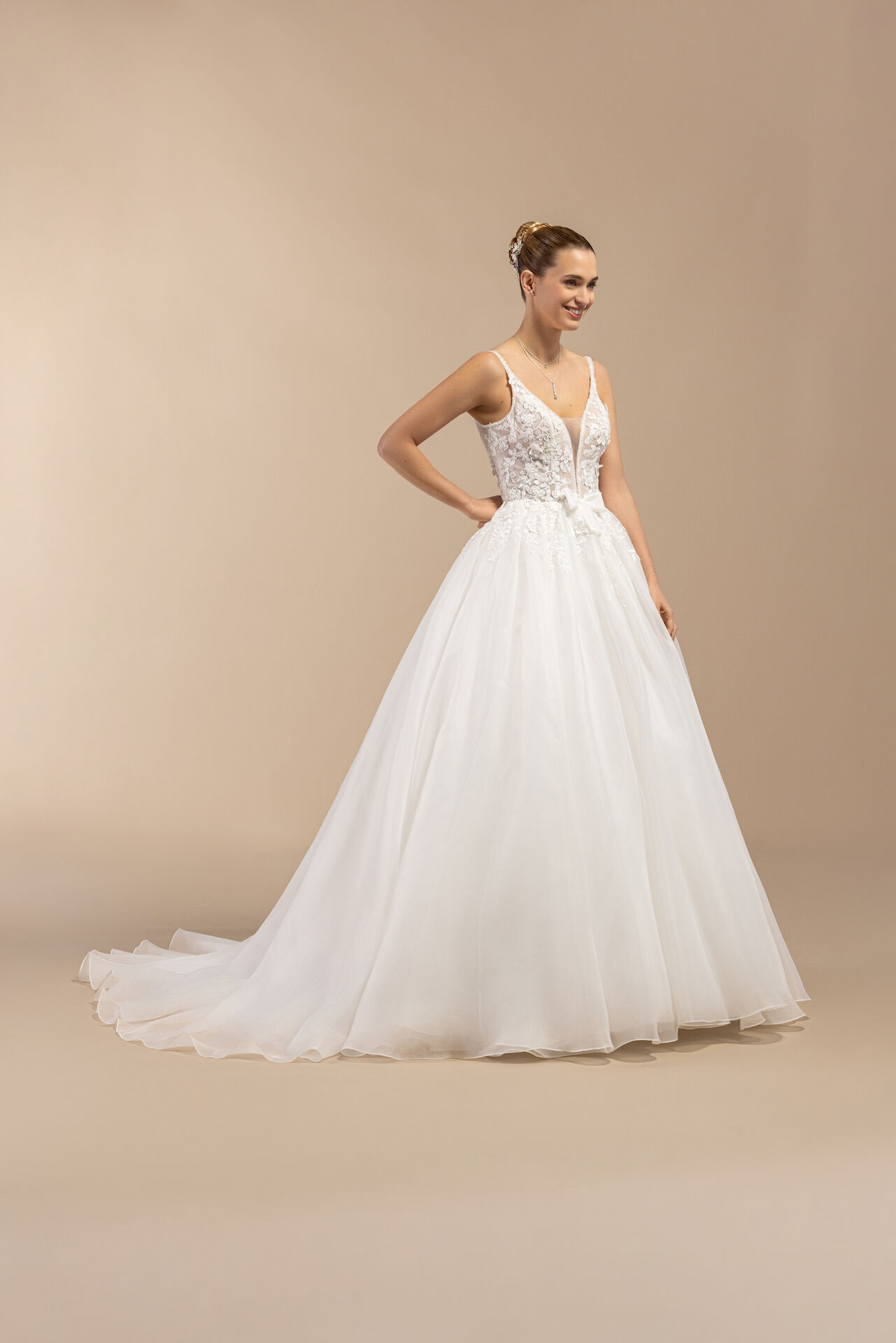La robe Butterfly séduit par sa coupe princesse intemporelle, idéale pour magnifier la silhouette tout en conservant une allure légère et romantique. Son bustier transparent orné de dentelle florale joue la carte de la modernité, tandis que la jupe en tulle aérien assure un tombé majestueux. Pensée pour les mariées exigeantes, cette création met à l’honneur l’excellence du savoir-faire français et la qualité des matières de prestige.