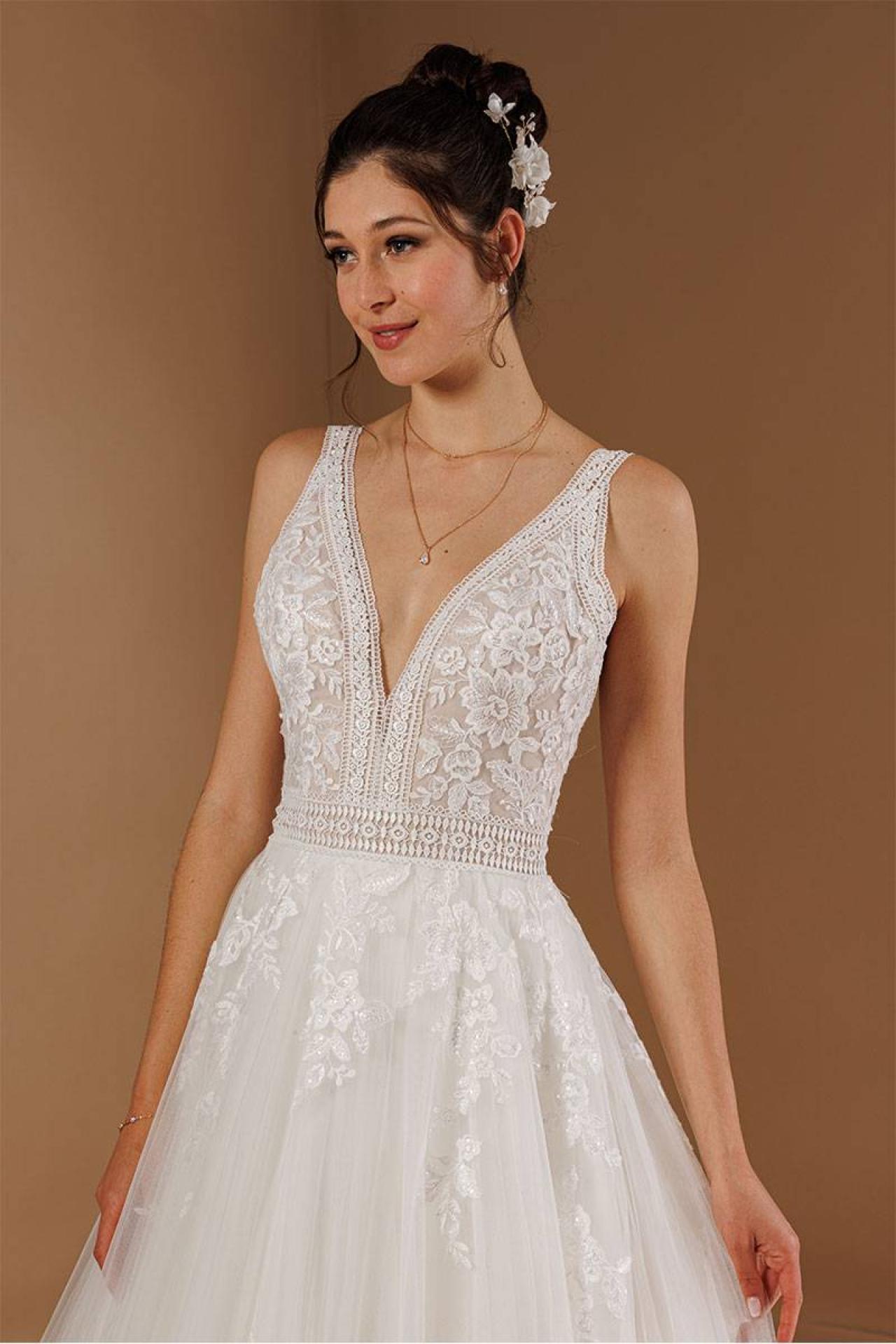 La robe de mariée Grèce est l'incarnation parfaite du mariage chic et élégant. Son bustier finement travaillé en dentelle vintage met en valeur votre silhouette, tandis que la jupe ample en tulle et dentelle apporte volume et légèreté à votre démarche. Chaque détail de cette robe nuptiale a été pensé pour faire de vous une véritable princesse le jour de votre mariage.