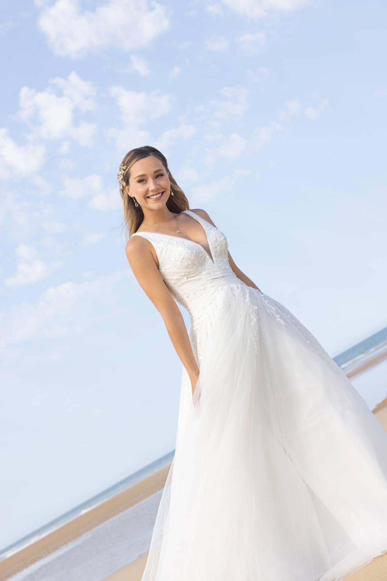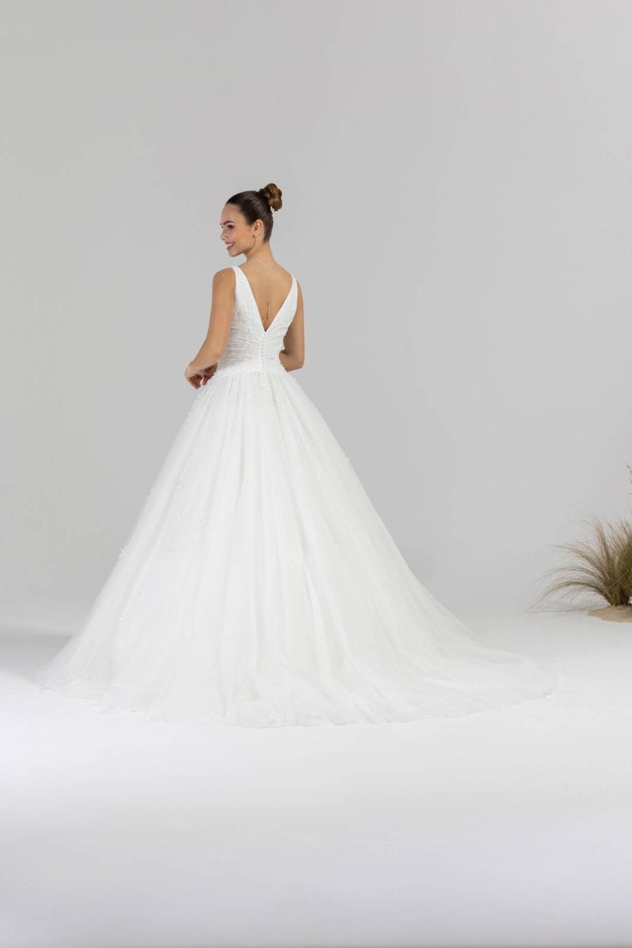 Cette robe de mariée style princesse est faite en tulle pailleté. Son décolleté V assure une touche de sensualité et son dos nu fait de cette robe une tendance incontournable. La ceinture croisée à la taille arborent une dentelle végétale qui apporte une touche naturelle à cette robe de mariée princesse.