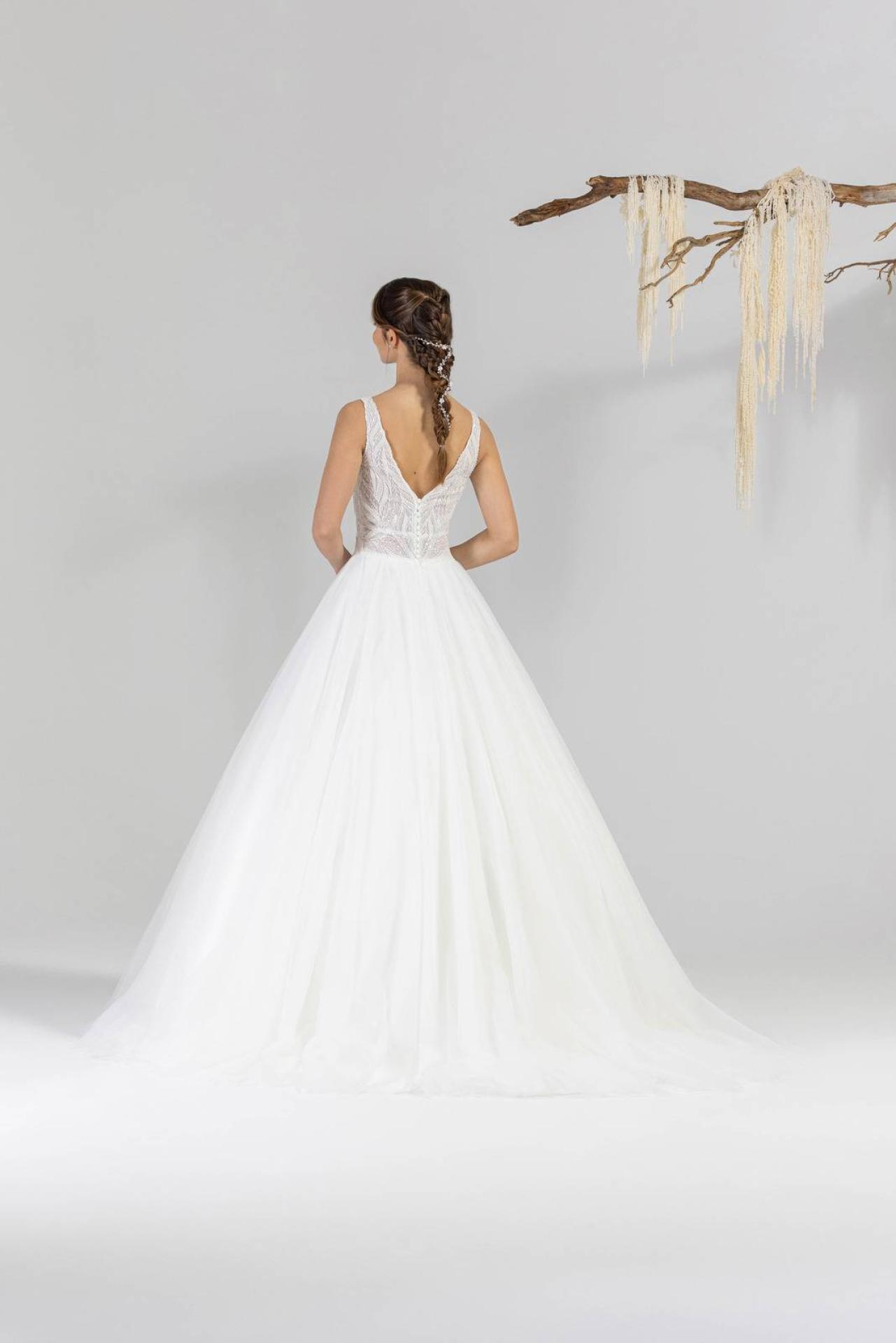 La robe de mariée princesse est une robe élégante et contemporaine. C’est une robe en tulle et confectionné par le créateur Eglantine mariage et cérémonie. Le décolleté de cette robe est en V recouvert d’une dentelle feuillage avec des touches de brillance. Le dos de cette magnifique robe de mariée princesse est ouvert.