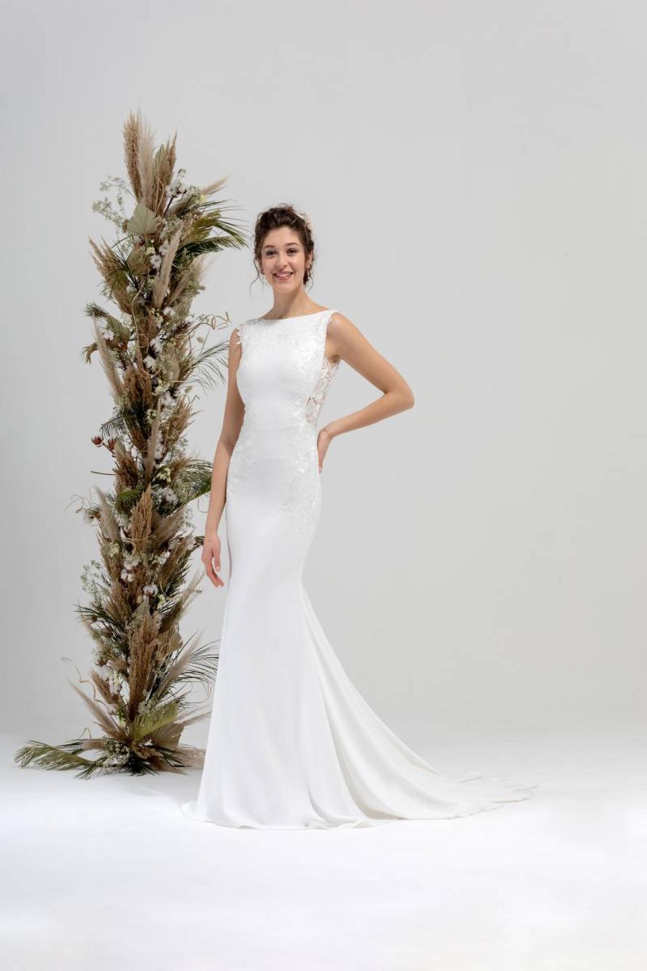 La robe de mariée référence Séduction porte bien son nom ! Forme sirène près du corps en crêpe fluide et léger. Cette création vintage est marquée avec un joli dos nu arrondi de tulle cristal à effet tatouage recouvert par des applications de dentelle qui apportent un coté moderne et original. Son corsage révèle une audacieuse transparence sur les cotés de la taille qui visiblement surprendra les convives.
