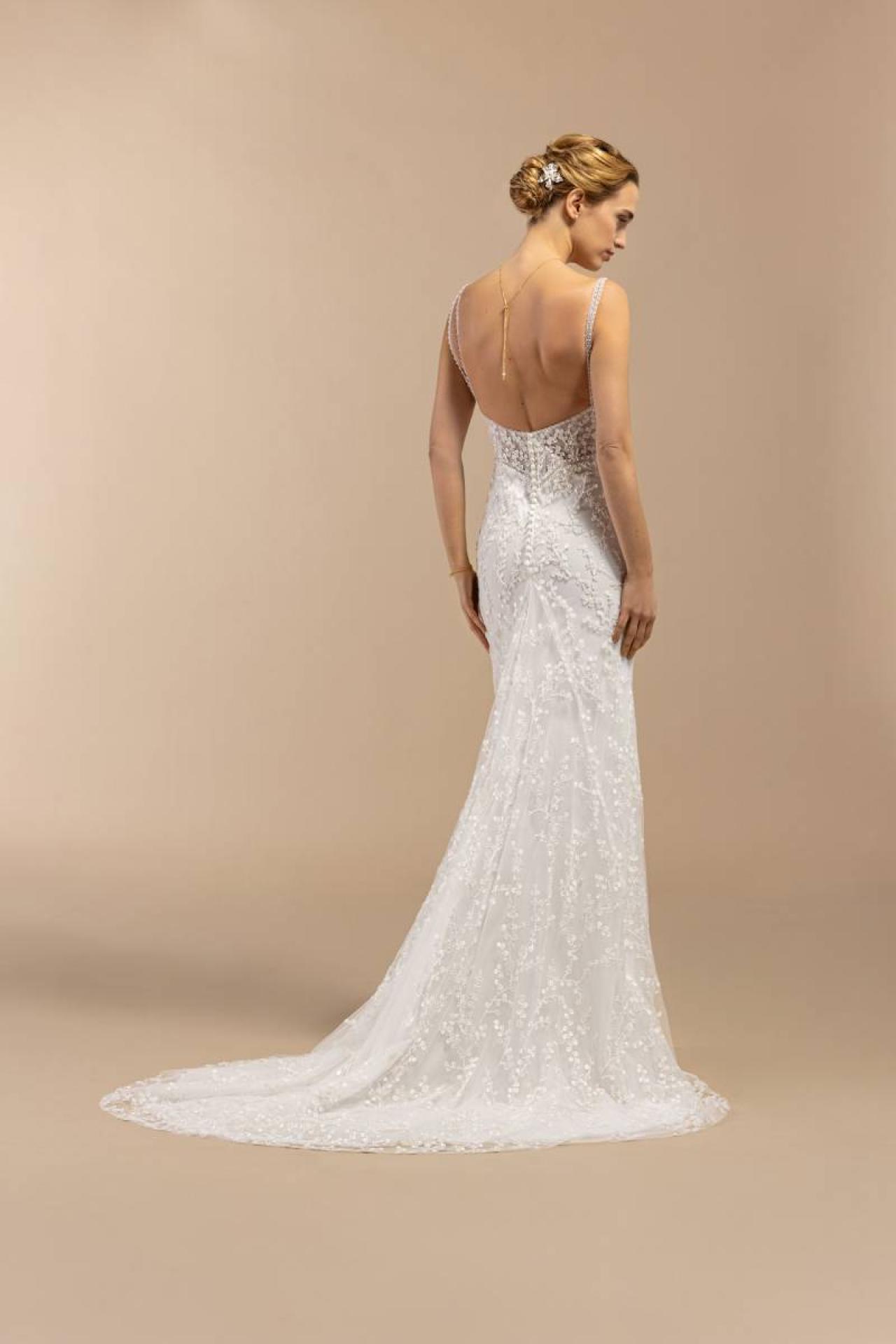 Traîne majestueuse : La longue traîne finit la silhouette avec panache, idéale pour une entrée remarquée lors de la cérémonie ou des séances photos.