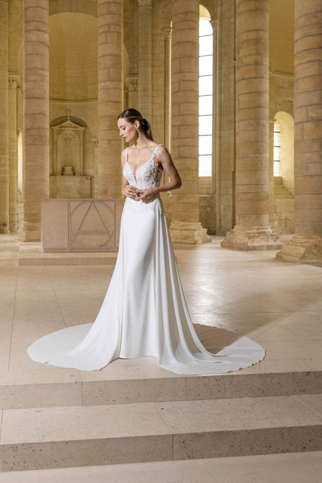 Les bretelles fines offrent maintien et délicatesse, tandis que les jeux de transparence dévoilent subtilement la peau, tout en garantissant style et confort. La BEL22614, réalisée dans un crêpe de qualité et ornée de broderies 3D, se prête aussi bien aux cérémonies de château, qu’aux soirées élégantes sur la Côte d’Azur ou dans une bastide provençale.