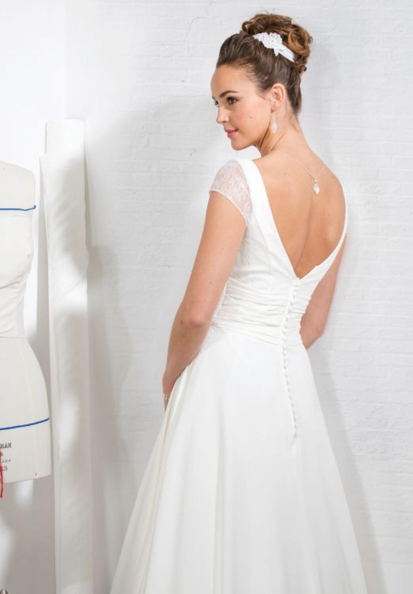 Retrouver votre robe mariée GLYCINE dans notre magasin Eglantine à marseille, cette robe créateur pas cher style haute couture avec son joli dos en V affine la silhouette et sa couleur blanc naturel illumine la robe de mariée.
