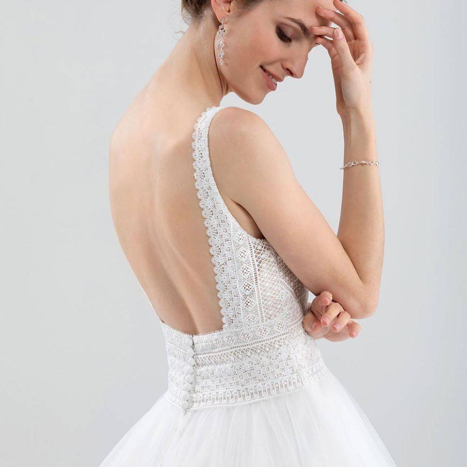 Notre robe de mariée ÉGLANTINE Mariages & Cérémonie référence SAHARA élue robe de la saison 2019-2020, une qualité de coupe moderne, une dentelle graphique vintage digne des plus grands créateurs, un rapport qualité prix exceptionnel 795€ à moins de 1000€.