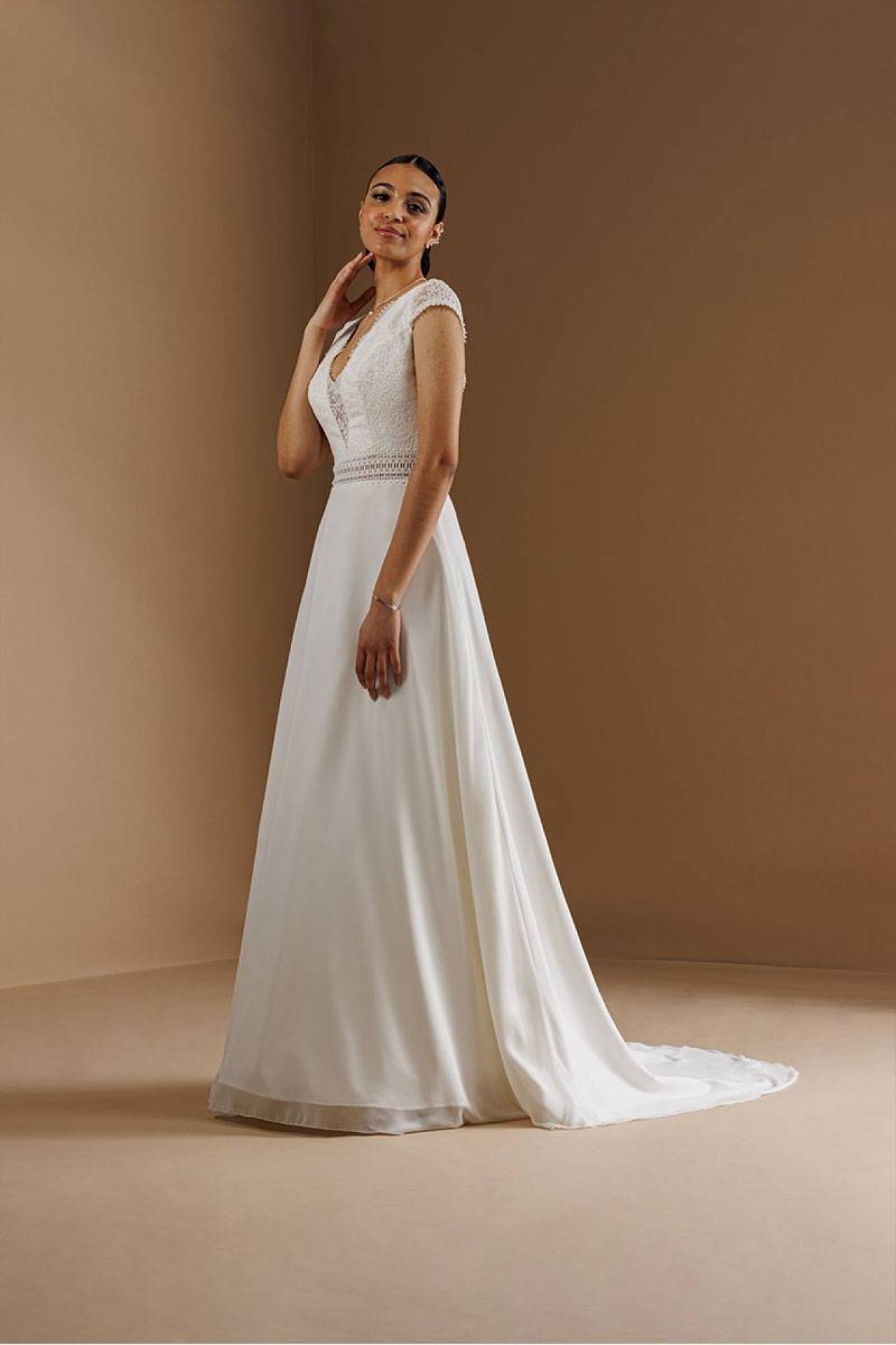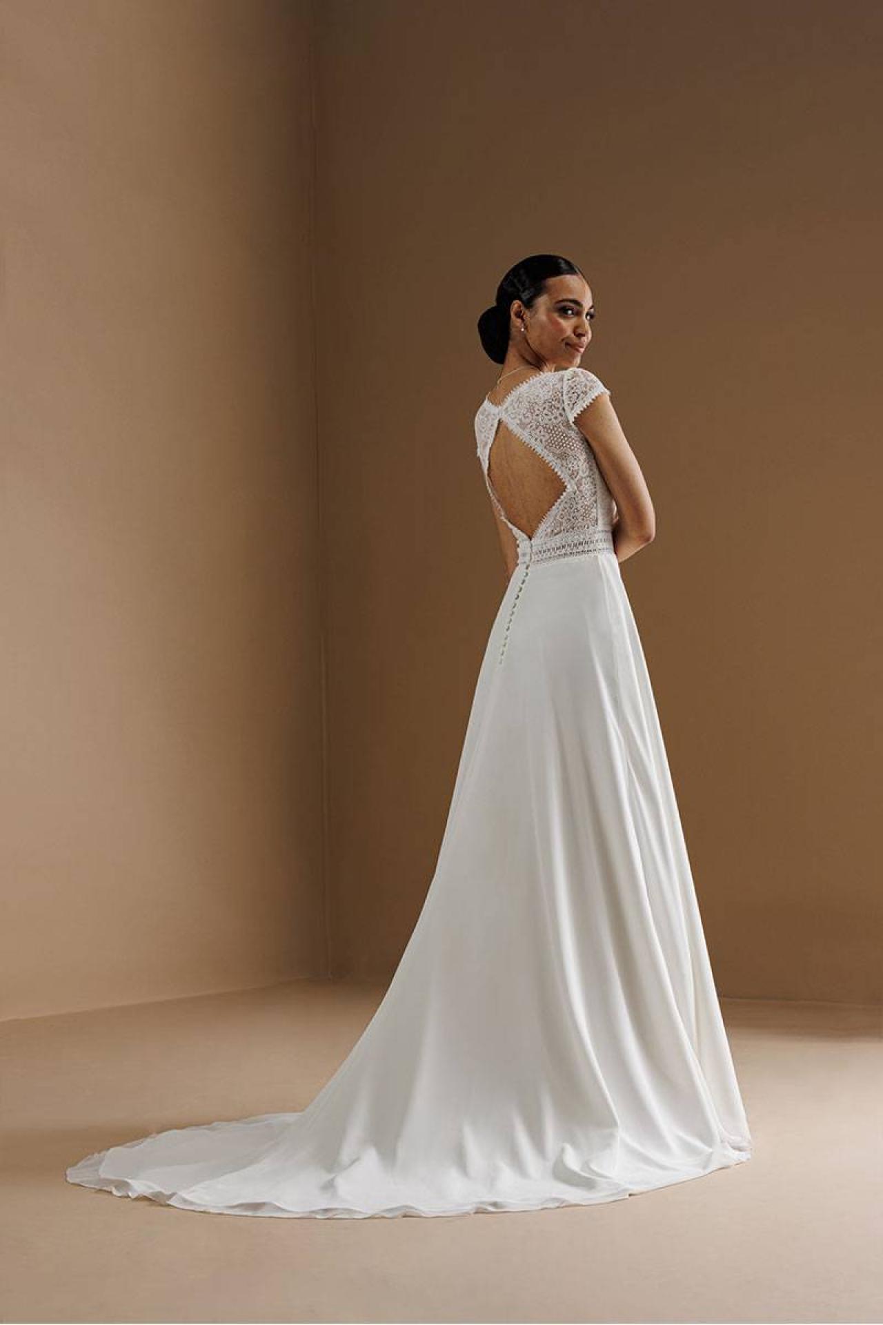 Envie d'une robe de mariée bohème chic ? La robe de mariée Gipsy est parfaite pour votre mariage champêtre. Son décolleté dos losange en dentelle et ses manchettes apportent un coté raffiné.