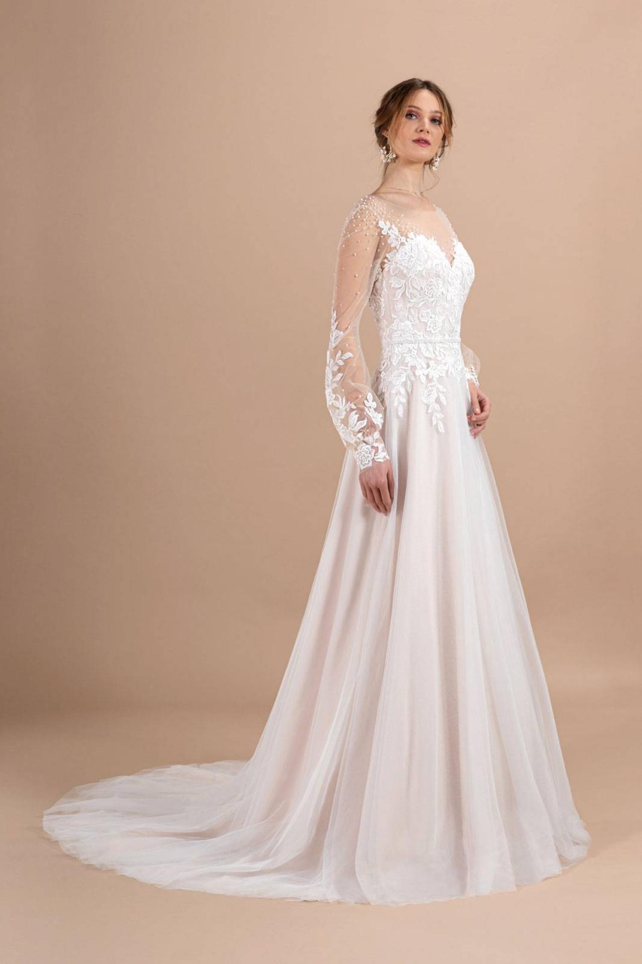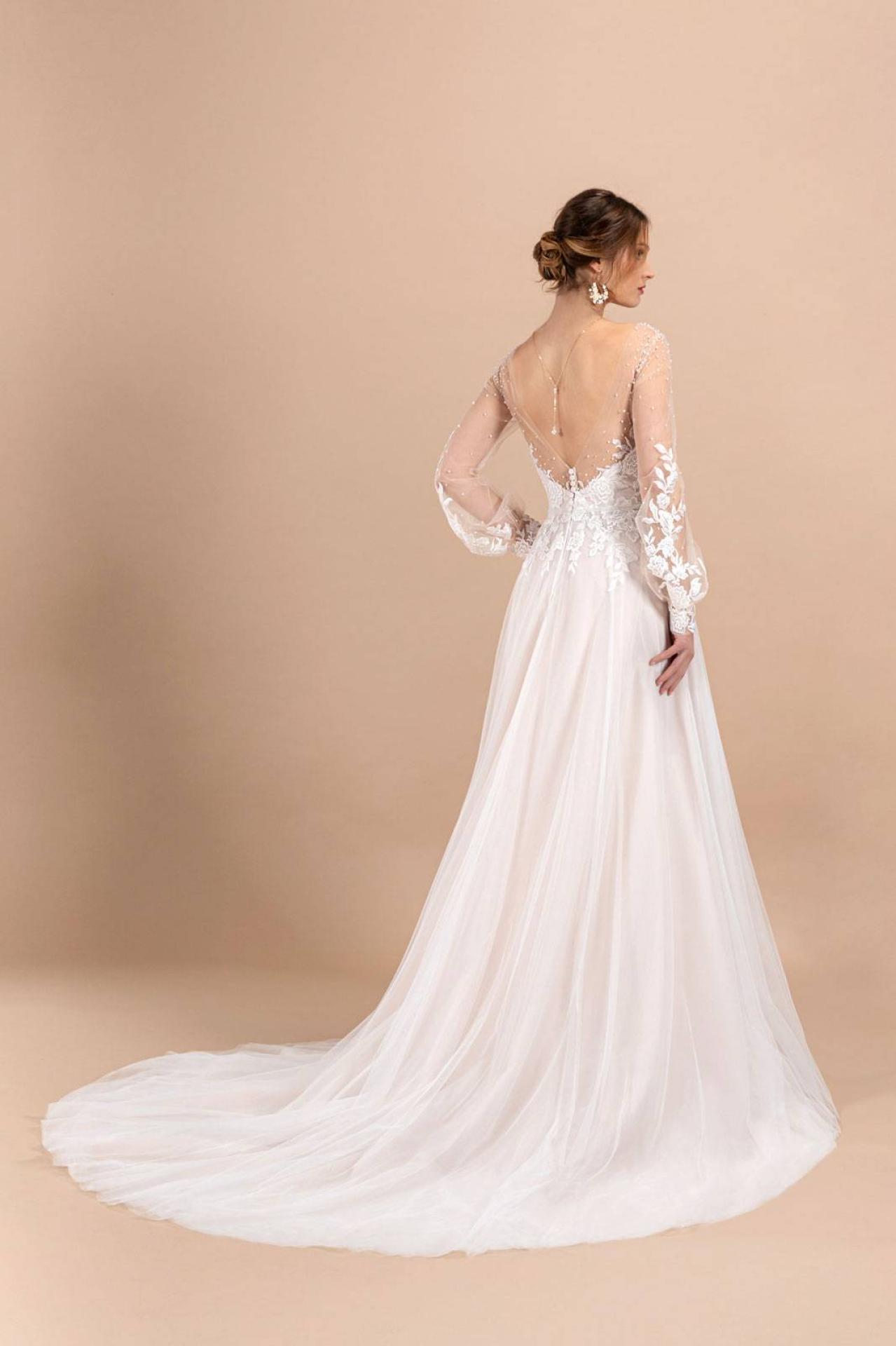 Robe de Mariée simple coloris nude dentelle fleurs 3D et tulle Aria de la nouvelle collection Églantine Créations 2023 disponible dans notre showroom boutique Églantine à Marseille centre ville. Ventes de robes de mariée bohème à marseille, Robe Aria créateur Églantine Marseille 13006 proche rue Paradis. Rapport qualité prix exceptionnel de robes à moins de 1000€, réserver votre rdv ...