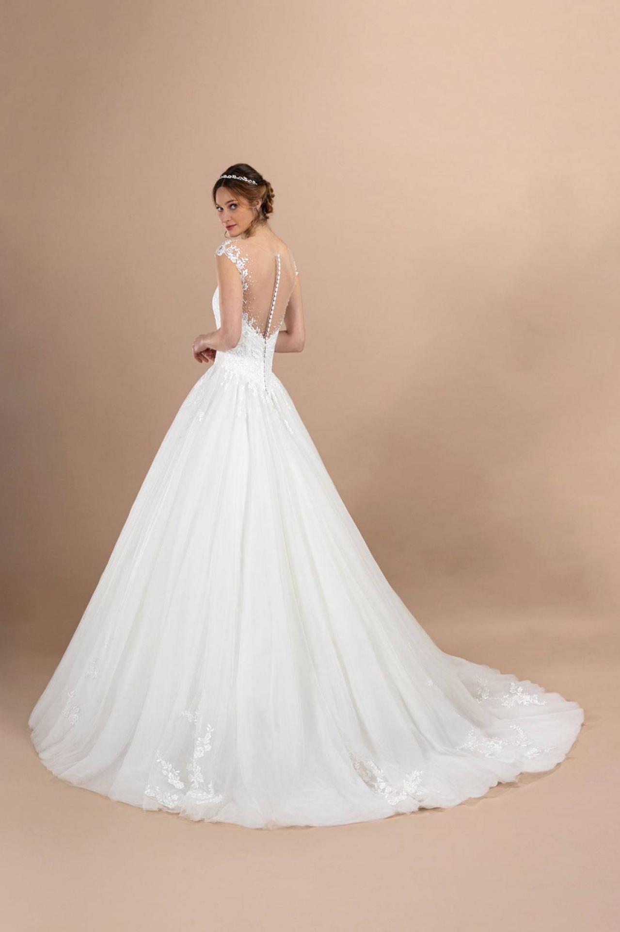 Conseils et essayage pour ce modèle : Robe de mariée fluide en tulle vers Nice 06000, Alpes-Maritimes : confection légère, matière aérienne et finitions délicates.
